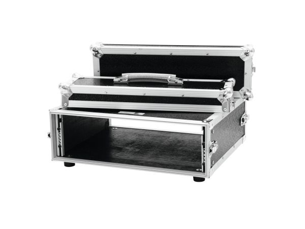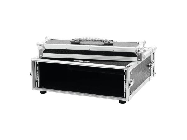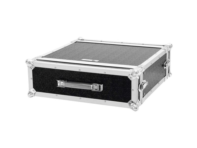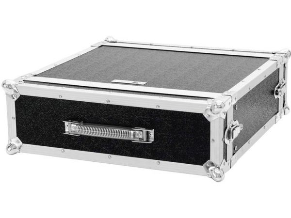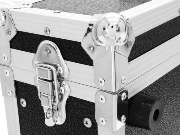 The flight case is equipped with four snap locks with eyelets for locking, built-in rack rails and a case handle.