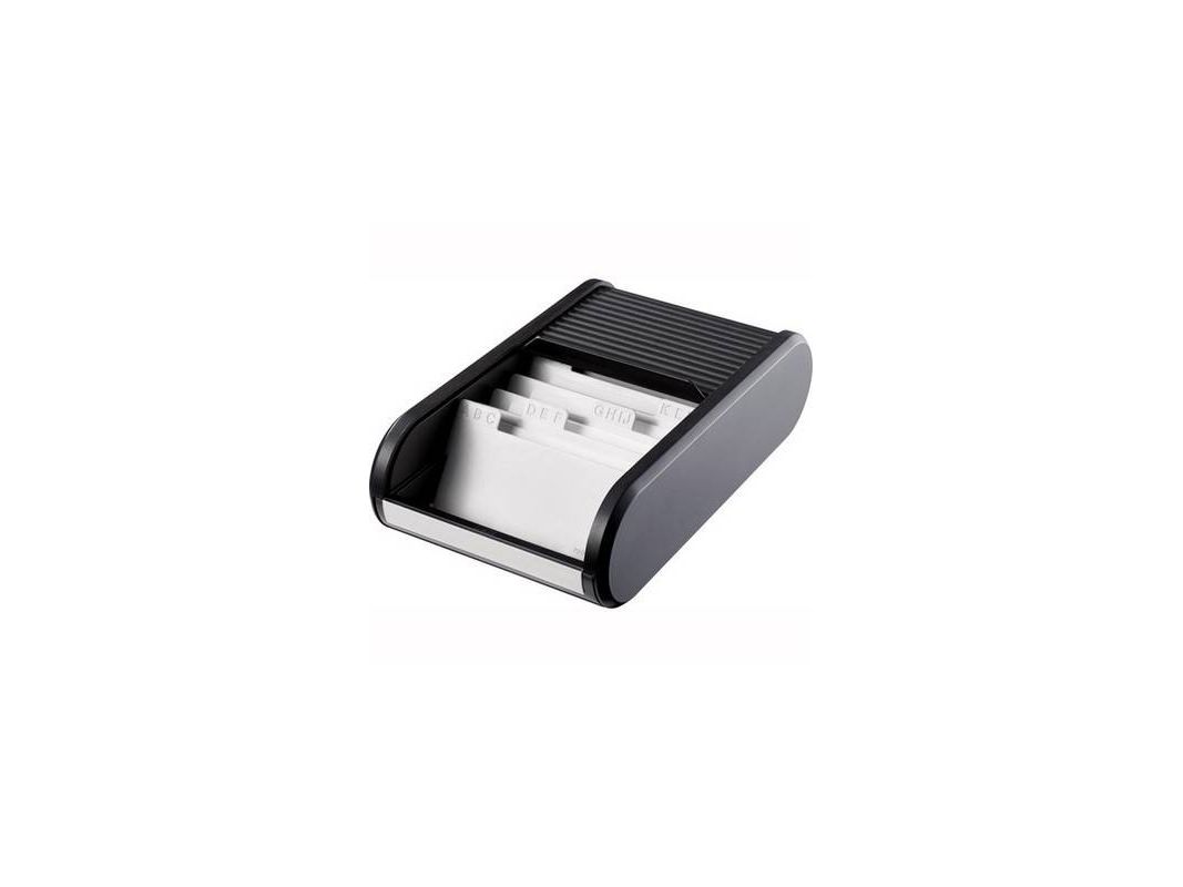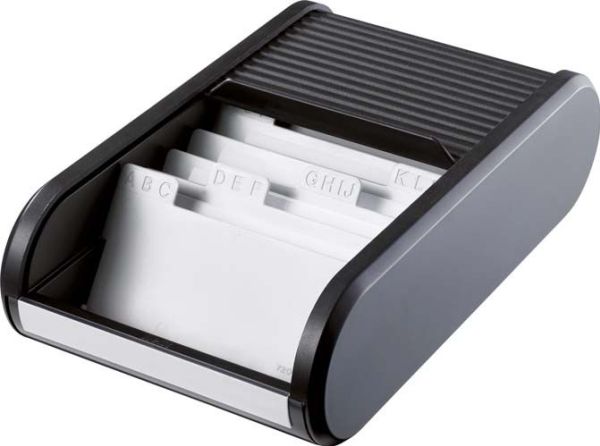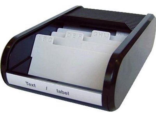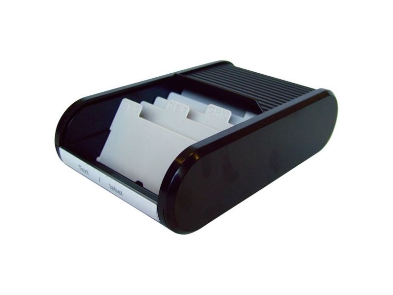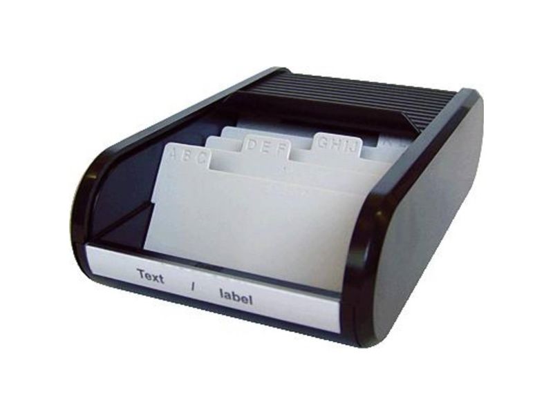 Visitkort-boks med roll lukning 8 delt alfabetisk opdeling til ca.300 visitkort med gummifødder.til, når du er på farten passer denne visitkortboks ved deres lave højde i næsten ethvert attachemappen.