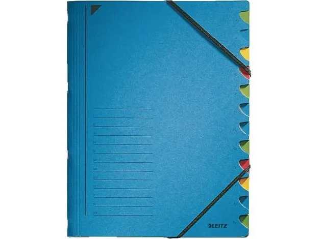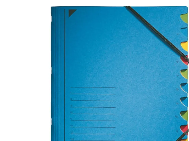 - Coloured thumb cut-outs for ease of use\n- Made of sturdy colourspan cardboard (320gsm)\n- Complete with corner straps to keep documents secure inside the folder\n- 12 part file