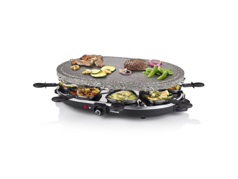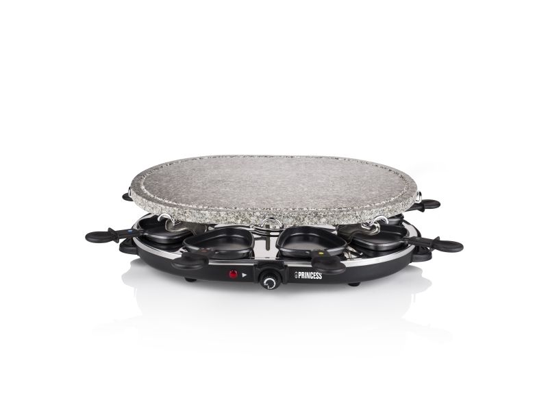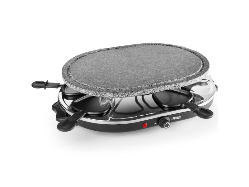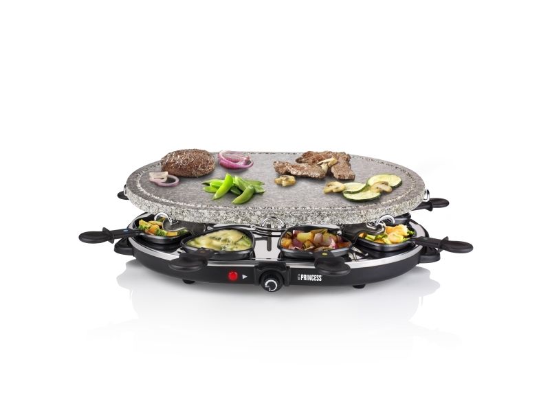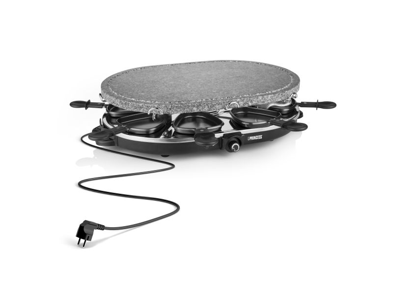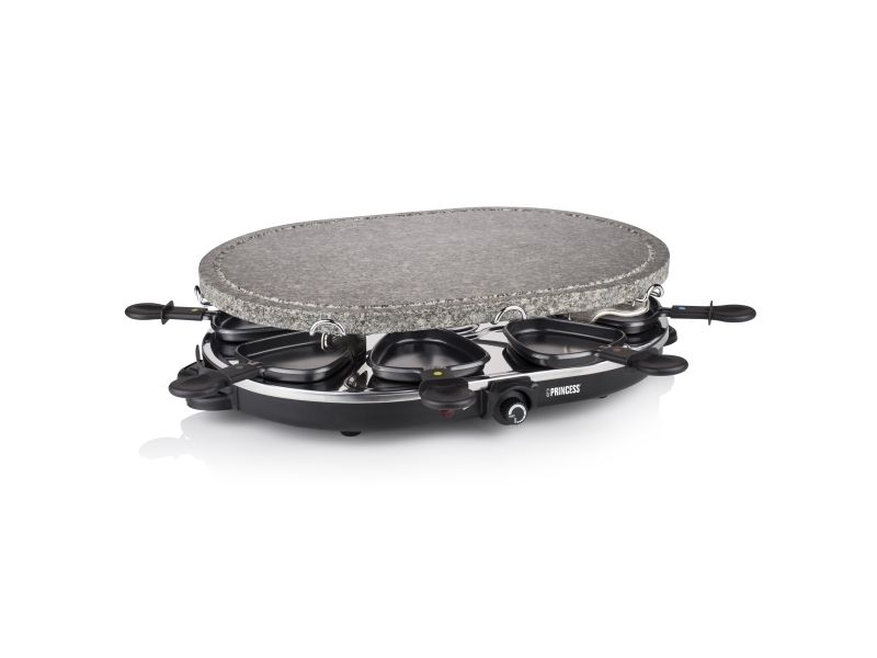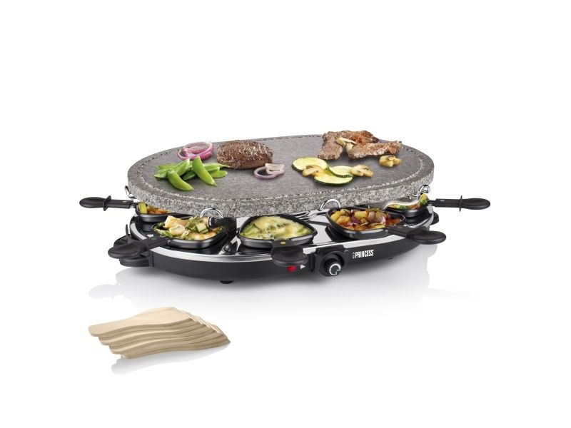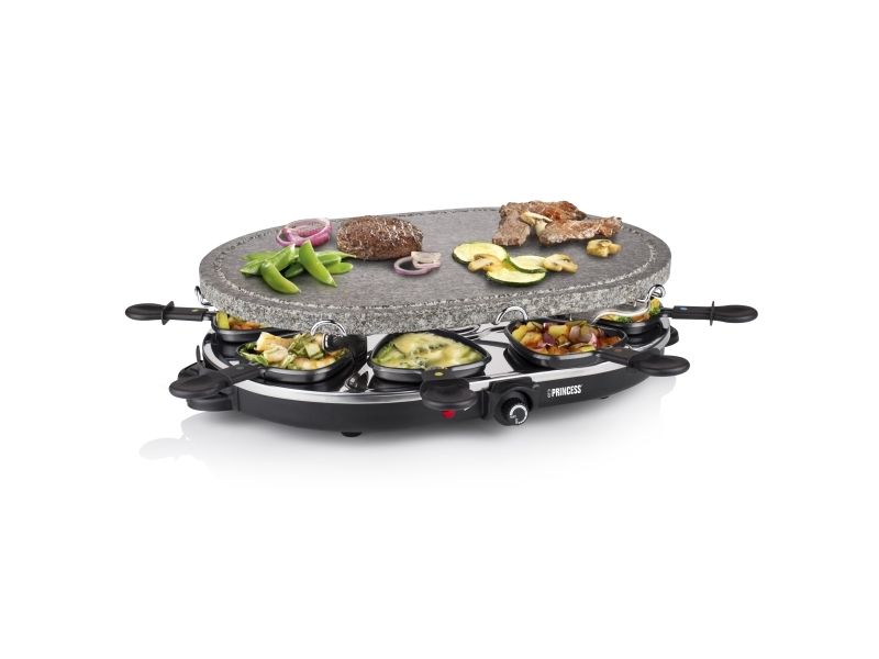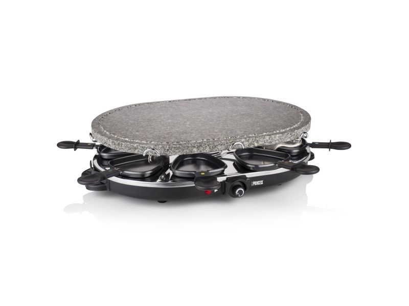 Reasons to choose the Princess Oval Stone Grill & Raclette Party:Combine stone grilling and raclette while being all together and everyone prepares their own favorite foodBlack housing with integrated thermostat for the optimal temperatureLarge baking surface of 43x30 cm suitable for up to 8 persons and including 8 pans and spatulasThe stone plate does not need to be heated up ahead of timeEasy to clean thanks to the dishwasher safe parts