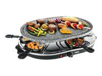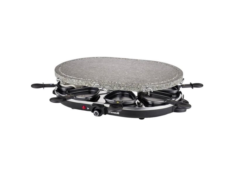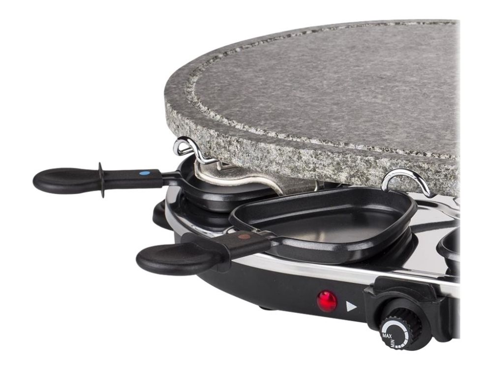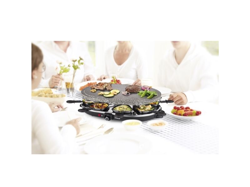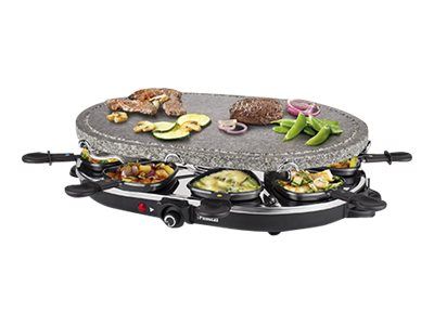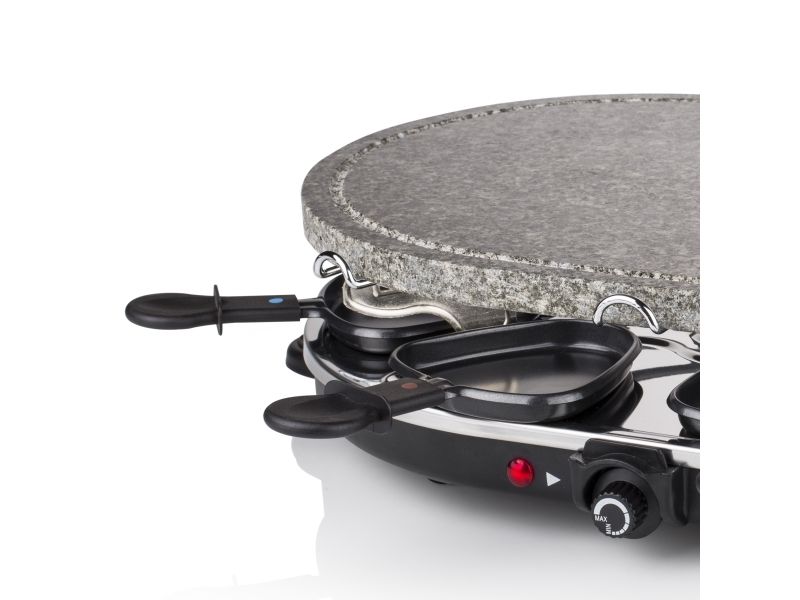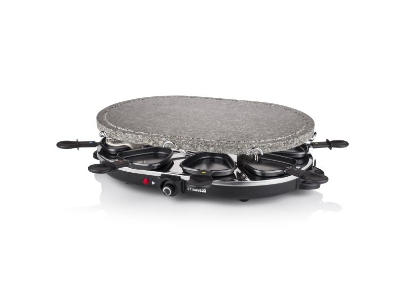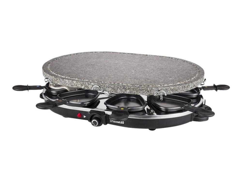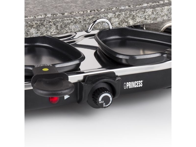 Reasons to choose the Princess Oval Stone Grill & Raclette Party:Combine stone grilling and raclette while being all together and everyone prepares their own favorite foodBlack housing with integrated thermostat for the optimal temperatureLarge baking surface of 43x30 cm suitable for up to 8 persons and including 8 pans and spatulasThe stone plate does not need to be heated up ahead of timeEasy to clean thanks to the dishwasher safe parts