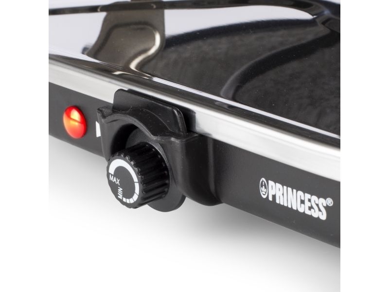 The Princess Oval Stone Grill & Raclette Party has an integrated thermostat so you can adjust the temperature to your liking. Thanks to the 1200 Watt power it reaches the ideal temperature fast and retains the heat for a long time. The stone grill plate does not have to be preheated in the oven.
