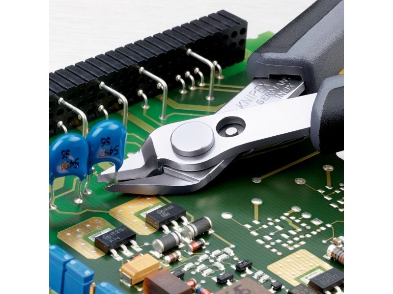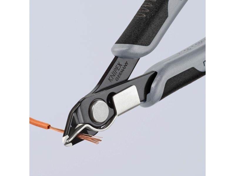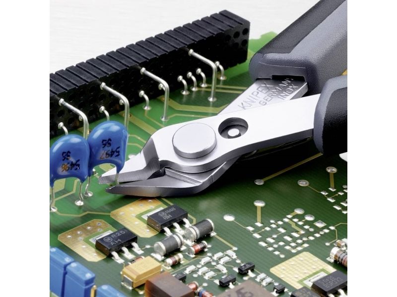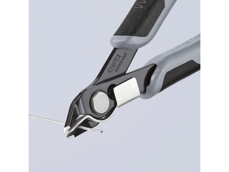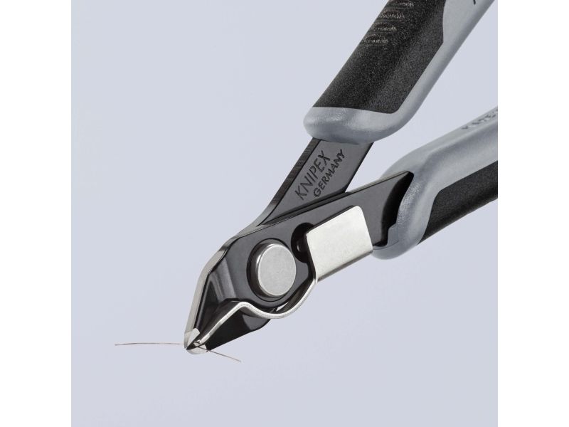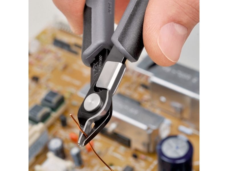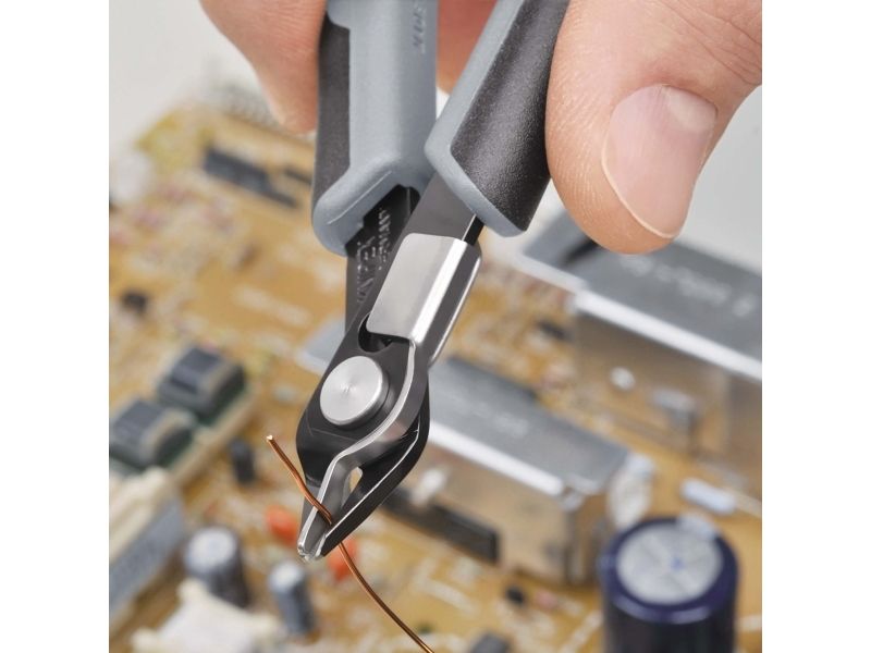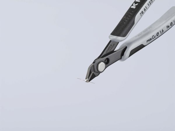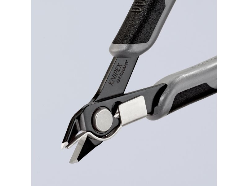 Præcisionstænger for fineste skærearbejder, fx inden for elektronik og finmekanik. Greb elektrisk ledende - dissipativ. Slebne, meget skarpe ægge uden facet. Skæresnit med kontrolleret micro-skærekantsforskydning, der sikrer lang levetid og ultra præcise snit, også ved de tyndeste tråde. Præcist udformede spidser skærer også tilstødende ledninger fra og med Ø 0,2 mm. Led med rustfri stålnitte. Går ekstremt let, så arbejdet ikke udmatter. Med åbningsfjeder og åbningsbegrænsning. med trådklemme - de afskårne stykker tråd springer ikke ukontrolleret væk. skær yderligere induktivt hærdede, skærhårdhed ca. 62 HRC. special-værktøjsstål, bruneret.