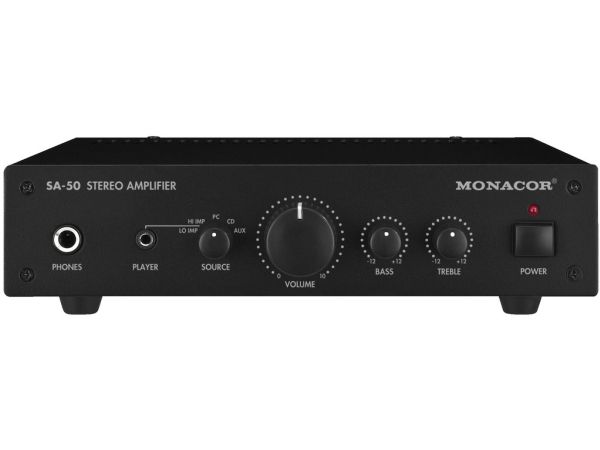 - Silent operation due to fanless cooling concept - Additional 3.5 mm connection with switchable sensitivity on the front panel - Audio source selector switch - Controls for volume, bass and treble - 6.3 mm headphone output - Robust metal housing