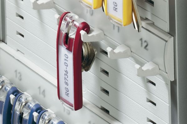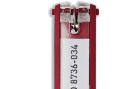 KEY CLIP with permanently visible label. The key is positioned flat behind. The label holder can be opened easily, without removing the key ring. To fit all KEY BOX models and KEY BOARD key panels.
