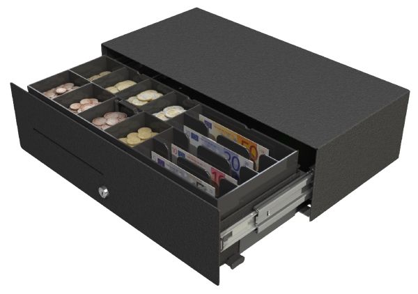 Strømkabel (3 m), fast pengeskuff (4 seddelspalter, 8 myntespalter)