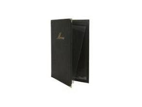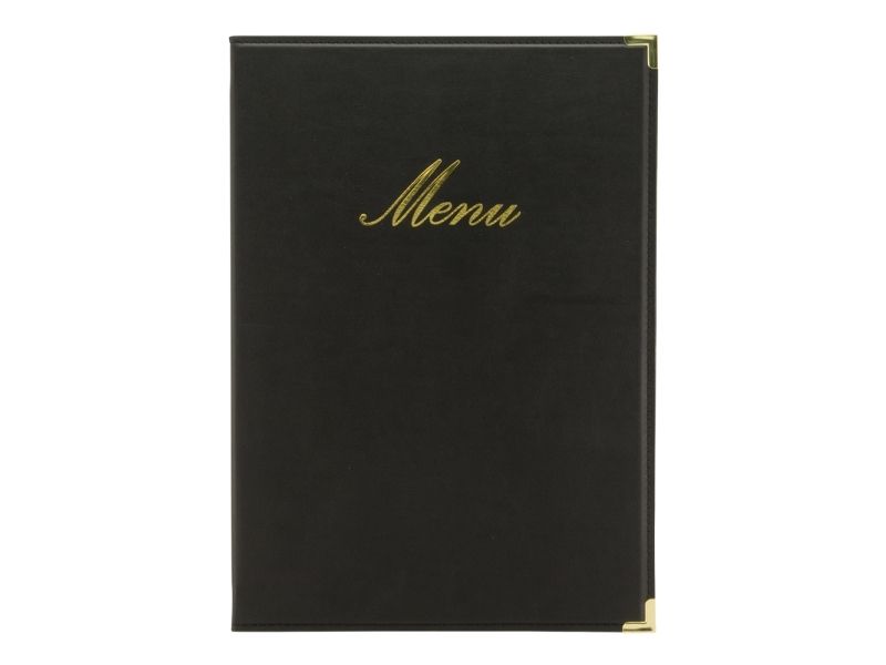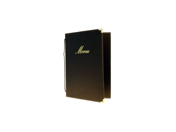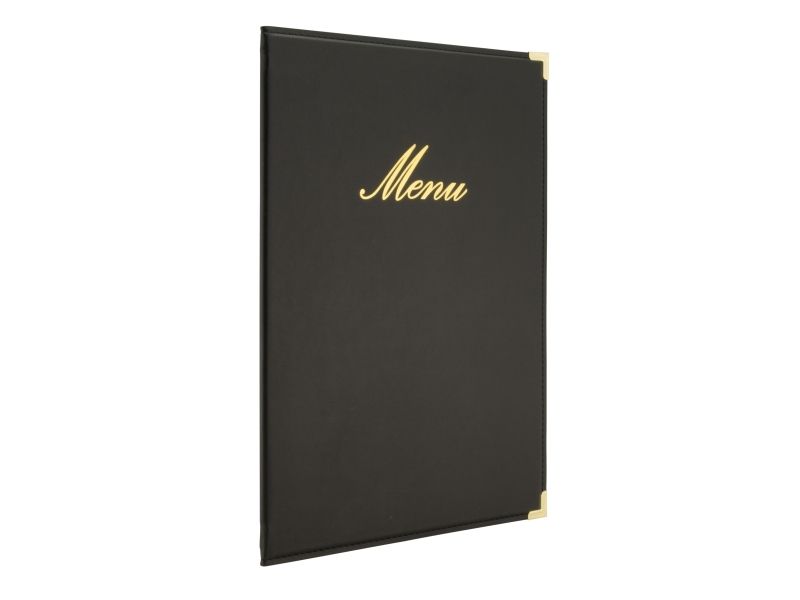 • Klassisk Securit® A4 menuomslag. Dette håndsyede, klassiske menuomslag i læderstil med »Menu" printed i guldfarve er perfekt til traditionelle barer og restauranter. Med guldfarvede metal hjørnebeskyttere er det designet til intensivt brug. En dobbeltsidet lomme til 4 x A4-sider inkluderet. Dette kan let udvides. Fås i forskellige farver og variationer.