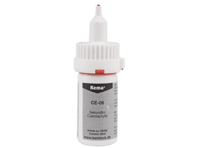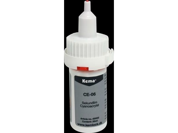 Kemlock CE-06 20ML sekundlim. Klar universal cyanoacryalat til elastomerer (fast gummi og/eller skumgummi), specielt god til SBR, NBR og EPDM. Giver virkelig god modstand mod termiske og klimatiske forandringer. Kan også med fordel anvendes på metal. Viskositet 20 - 40 mPas ved 25°C. Flammepunkt 87°C DIN 55213. Hærdetid 1-30 sek. Alt efter materialet og temperatur. Gennemhærdet efter 24 timer. Temperatur -30°C til +180°C. Anbefalet handske: NITRIL eller SOL-VEX.