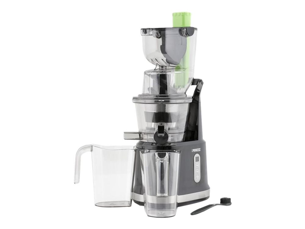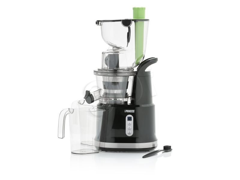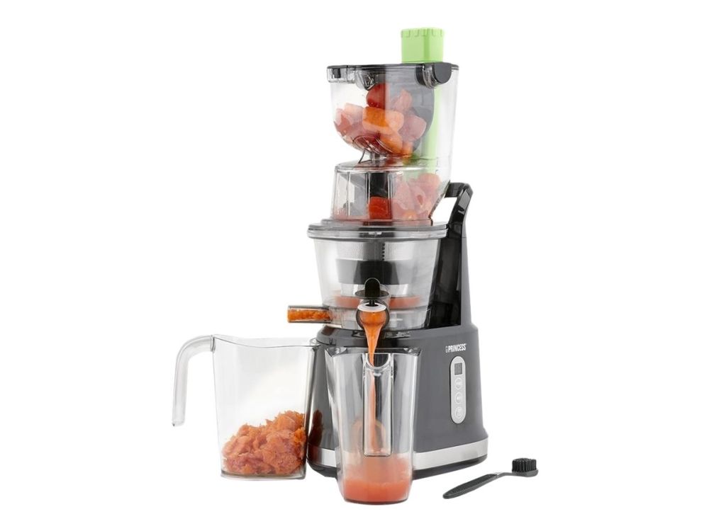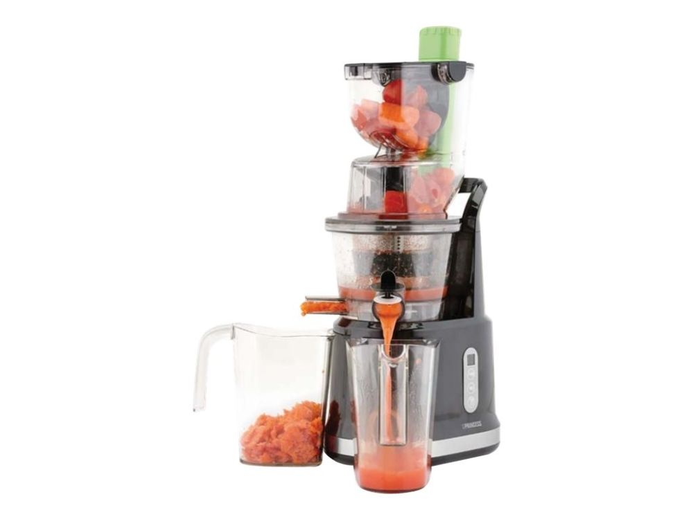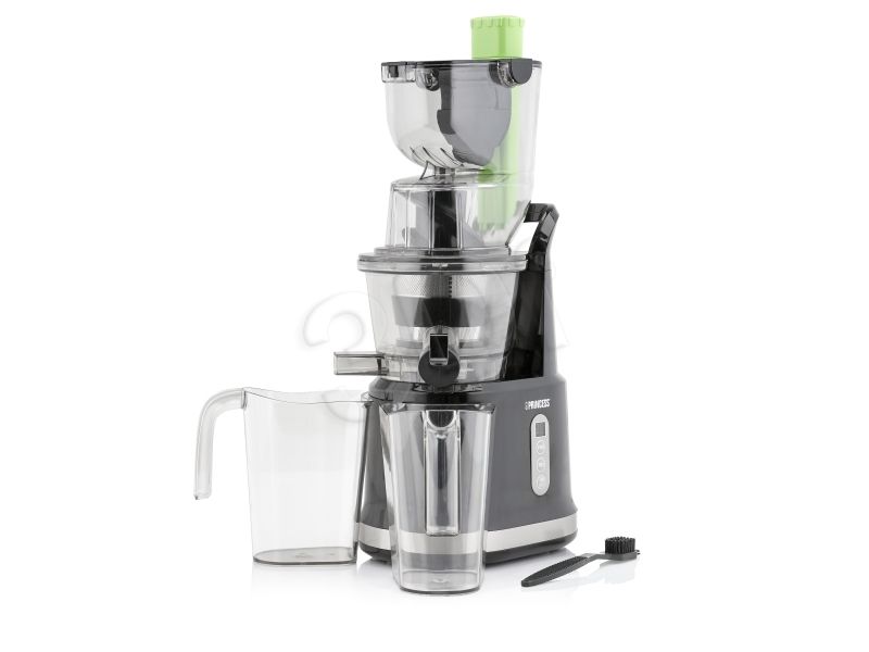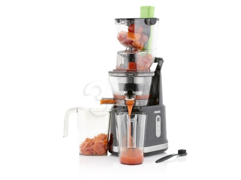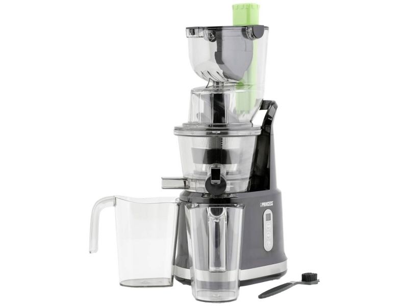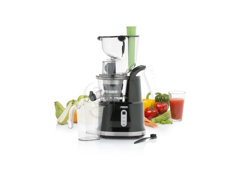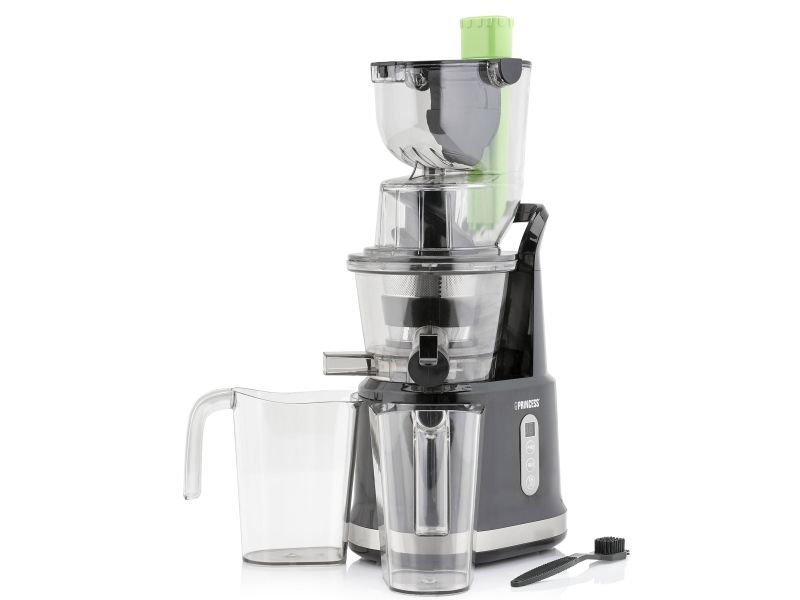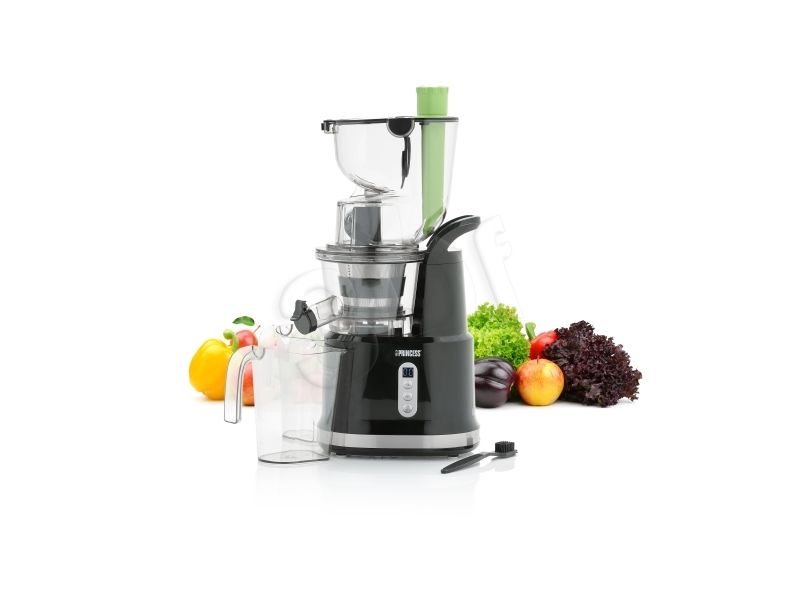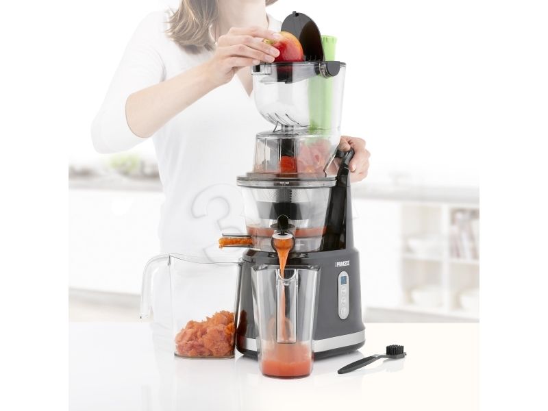 Reasons to choose the Princess Easy Fill Slowjuicer: - Unique extra-large feeding tube so you can add whole apples and tomatoes - The powerful motor generates slow grinding rotations that extract a lot more juice than a traditional juicer - Vertical conical spindle and sieve to maximise the nutrients, vitamins and taste - Perfect for a healthy lifestyle with fresh fruit and vegetable juices or prepare healthy soups - Easy to clean thanks to the dishwasher proof parts