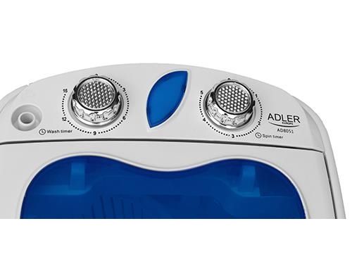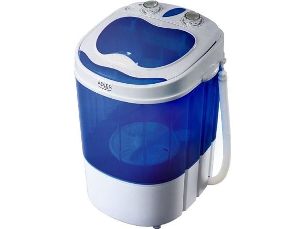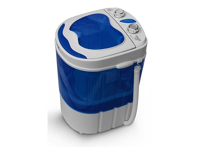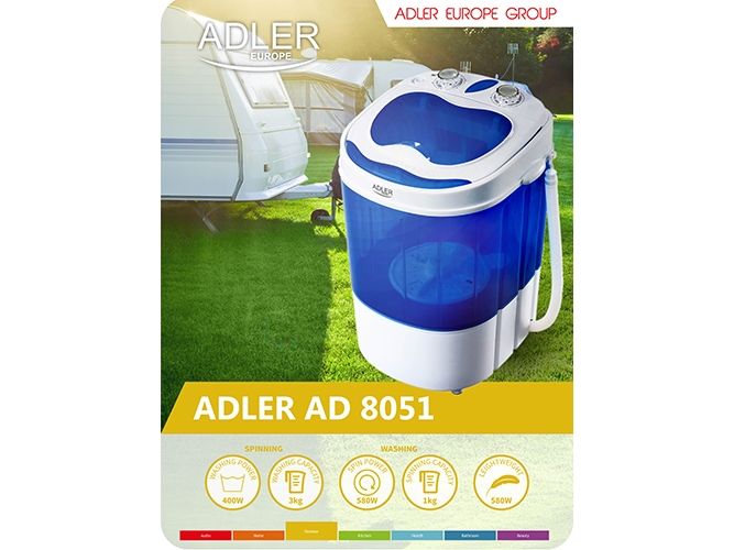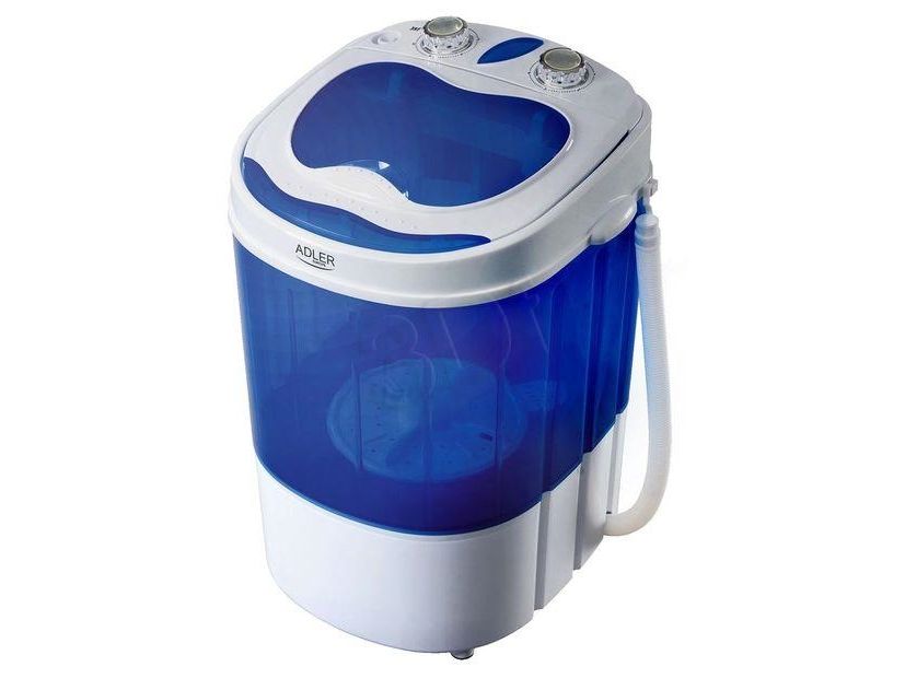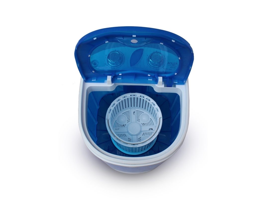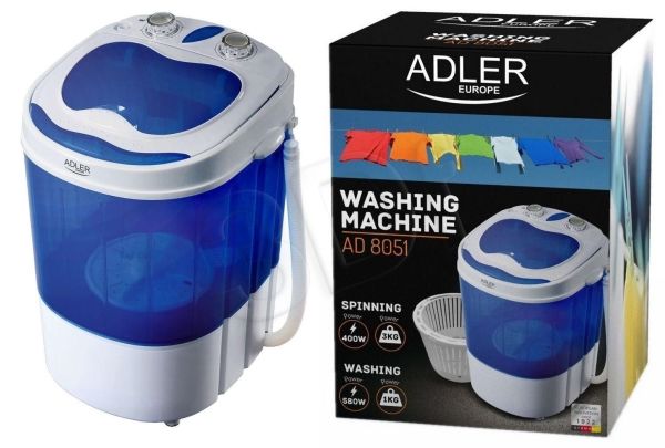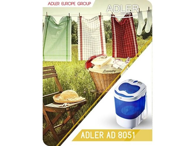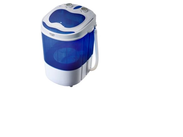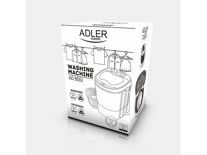It is not always possible to have access to a standard washing machine or a laundry when you need to wash your clothes: such a case might appear during a longer trip, going camping or even at home, when your standard washing machine gets broken. Sometimes it also happens that you need to laundry few things fast and it is unecological, unsafe and uneconomical to start the washing machine. In all those cases AD8051 mini washing machine can be a solution. It is small and light, therefore easy to be transported. Since it does not occupy much space, it can be placed even in a camping van or in a small flat. This lightweight and compact washing machine has a capacity of 3kg. It is perfect for washing small amounts of laundry – even delicate fabrics. Its washing programme is short, it lasts only 15 minutes. The device has low water and energy consumption and is easy to use. It also has a spinning program to use after the garments are washed.Adler AD 8051. Loading type: Top-load. Rated capacity: 3 kg. Product colour: Blue, White. Width: 360 mm, Depth: 370 mm, Height: 530 mm