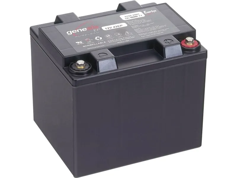 Enersys Genesis EP blybatteri Vedligeholdelsesfri · Lav indre modstand · Hurtig opladning · Kan anvendes overalt · Lille selvafladning · Høj effekttæthed · Lang levetid · Tynde plader af rent bly-tin · Meget pålidelig · Svært antændelig i henhold til UL 94V-0 · Stød- og vibrationssikker · Indbygget sikkerhedsventil · Ekstrem temperaturområde · Høj ledeevne Premium-højtydende blybatteri til krævende opgaver. Overbeviser ved en hurtig opladning, minimal selvafladning, lav indre modstand og ekstremt gode temperaturegenskaber. Fremstillet af 99,99 % rent bly-tin med meget tynde plader til højeste ydeevne og pålidelighed. Den rene syre bundtes sikkert i fleece og sørger for en effektiv drift. Det robuste kabinet er stød- og vibrationssikkert samt svært antændeligt. Blybatteriet kan anvendes uafhængigt af stedet og giver en lang række anvendelsesmuligheder som for eksempel mobilt udstyr, telekommunikation, nødstrømforsyning, e-mobilitet, medicinsk udstyr, alternativ energi, haveredskaber og meget andet.