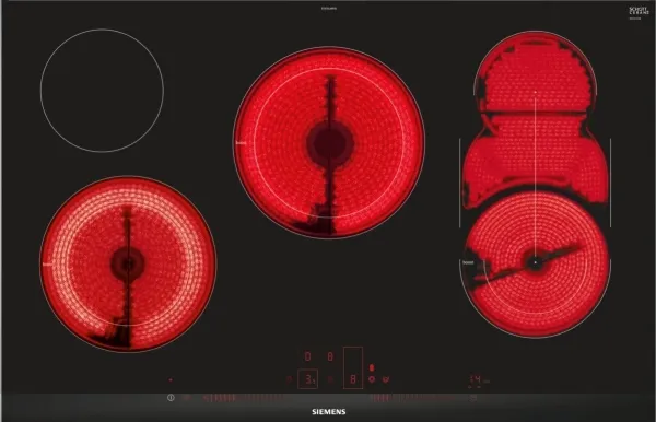 2 x keramisk strålende element - 1200 W - 145 mm 1 x keramisk strålende element - dobbelring - 2100/3000 W - 145/210 mm 1 x keramisk strålende element - CombiZone - 2000/2300 W - 120/180/180x270/180x370 mm 1 x keramisk strålende element - dobbelring - 2400/3400 W - 180/230 mm
