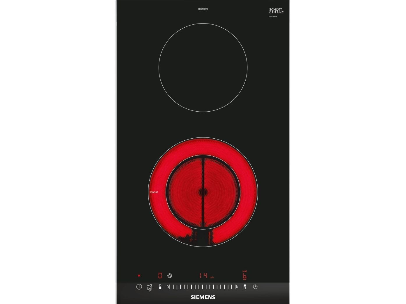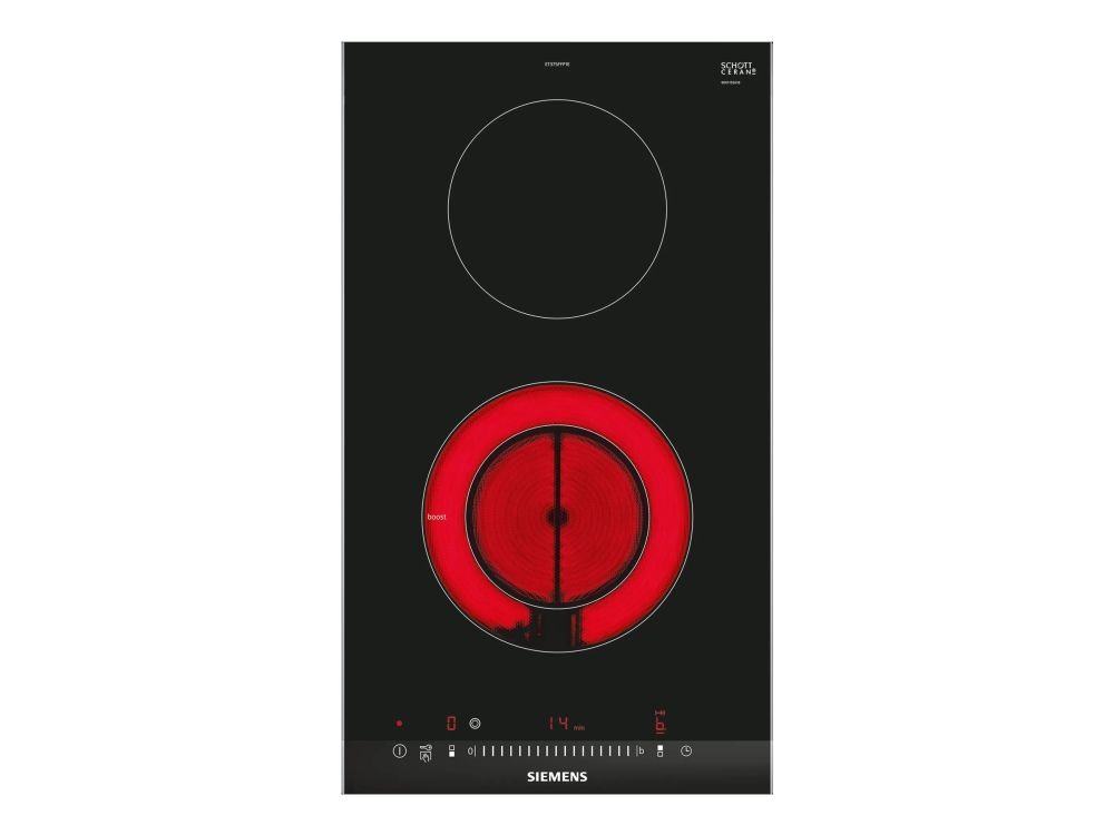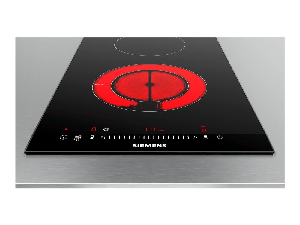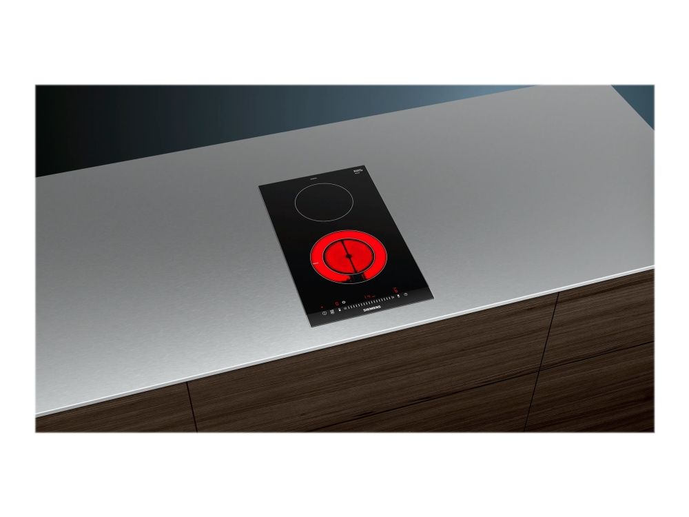 Siemens iQ300 ET375FFP1E - Keramisk komfyrtopp - 2 plater - Nisje - bredde: 27 cm - dybde: 49 cm - med sidepynt av rustfritt stål, - med fasettert frontkant - børstet aluminium / svart