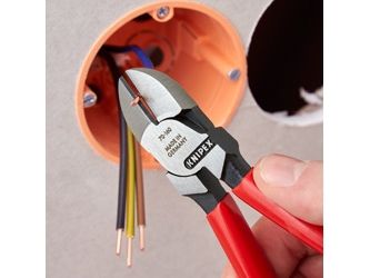 slank hovedform til brug på vanskeligt tilgængelige arbejdsområder. Det uundværlige sideskær til mange forskellige anvendelser. Førsteklasses materiale og præcis forarbejdning for en lang standtid. Præcisions-skær til blød og hård tråd. Pænt snit ved tynde Cu-tråde, selv ved skærspidserne. Skær yderligere induktivt hærdede, skærhårdhed ca. 61 HRC. med forlænget skær. Med komfort-håndtag: fremstillet af tre ergonomiske komponenter til optimeret håndtering og med to KNIPEXtend-grænseflader til forlængelser. med facet.