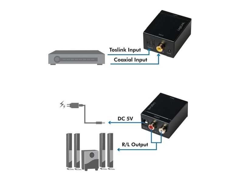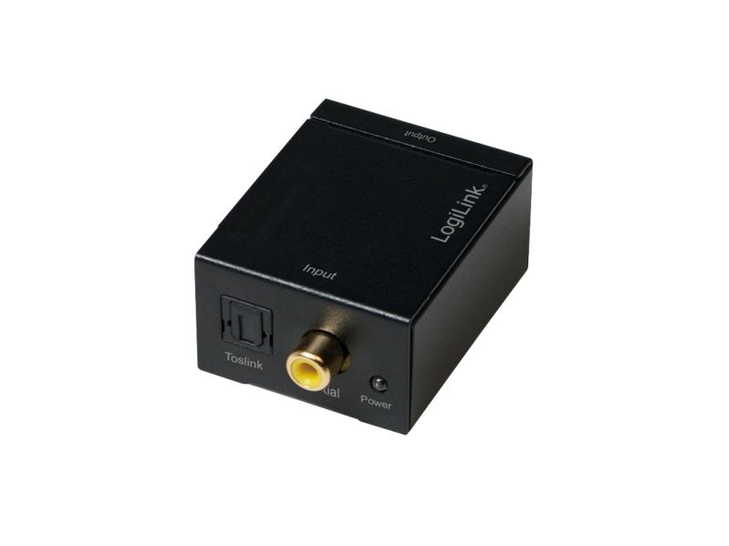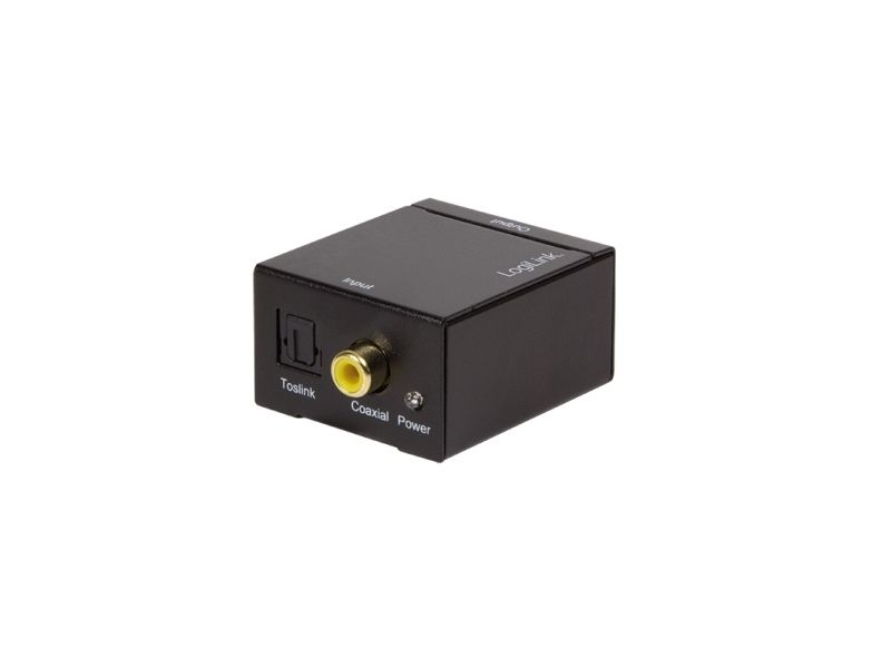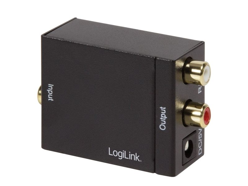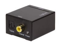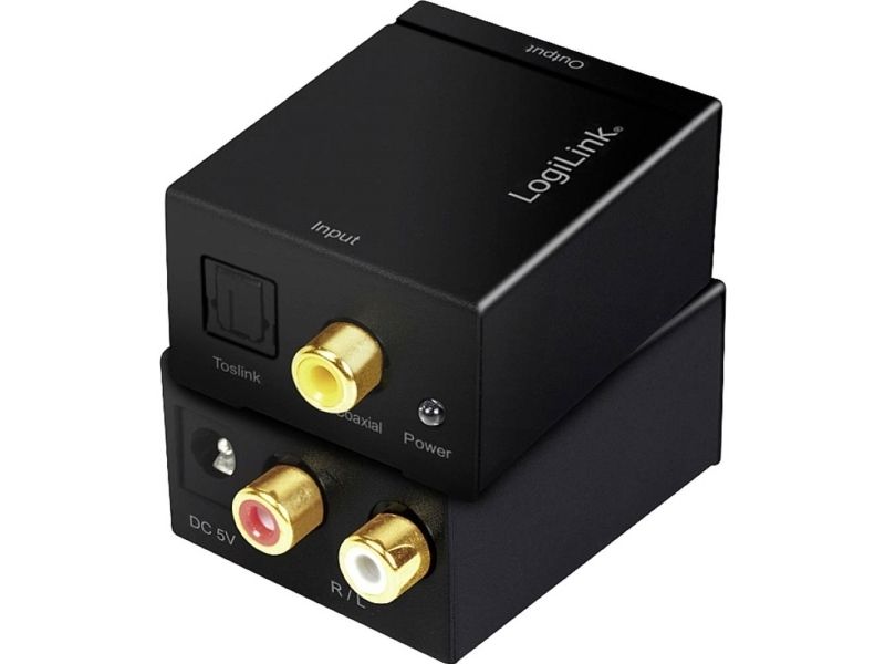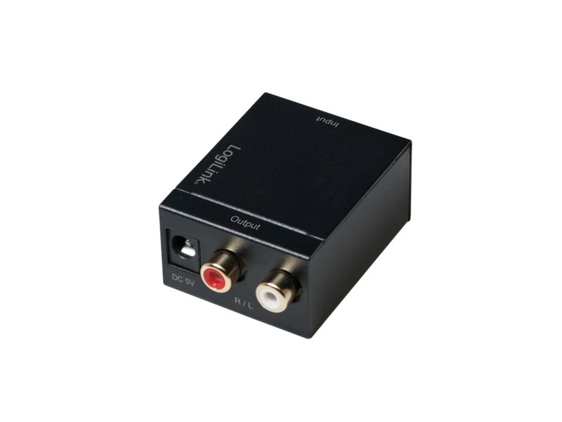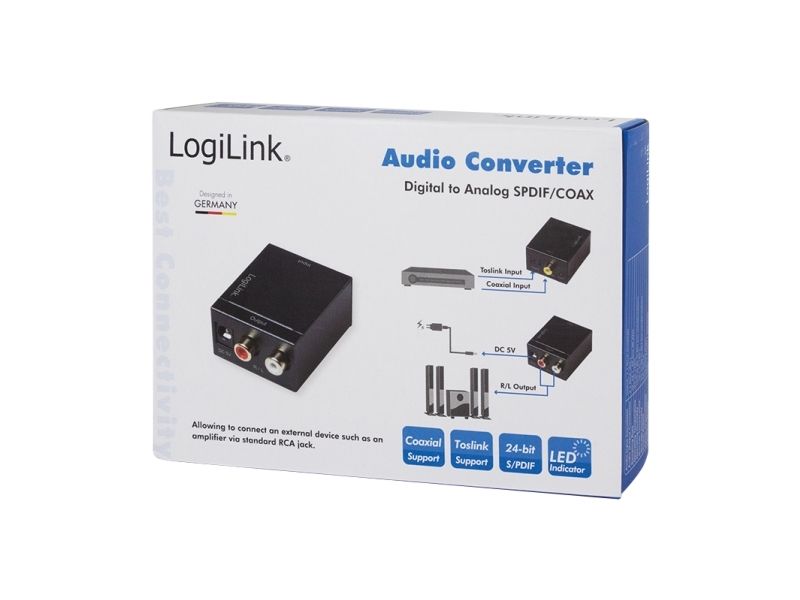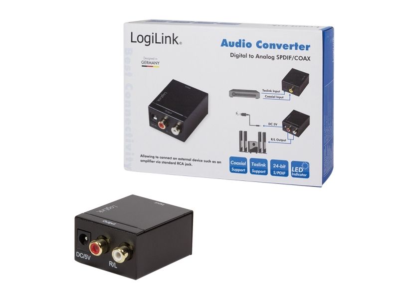 The digital to analog audio converter converts digital Coaxial or Toslink audio signals to analog L/R audio. Standard RCA-style jacks enable you to connect the converter to an external device like an amplifier. Ideal for home use or professional audio switching.