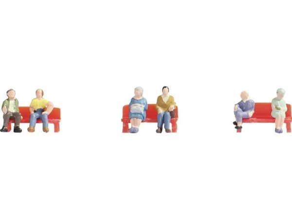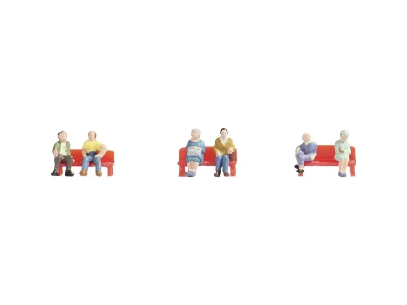 The »Sitting People« model figure set contains six figures in total – three women and three men. All of the figures are hand-painted and may be placed anywhere on your model railway layout or diorama. The NOCH Temporary Glue (ref. 61121) is the best choice for adhering the figures and then removing them at a later time without any issues.