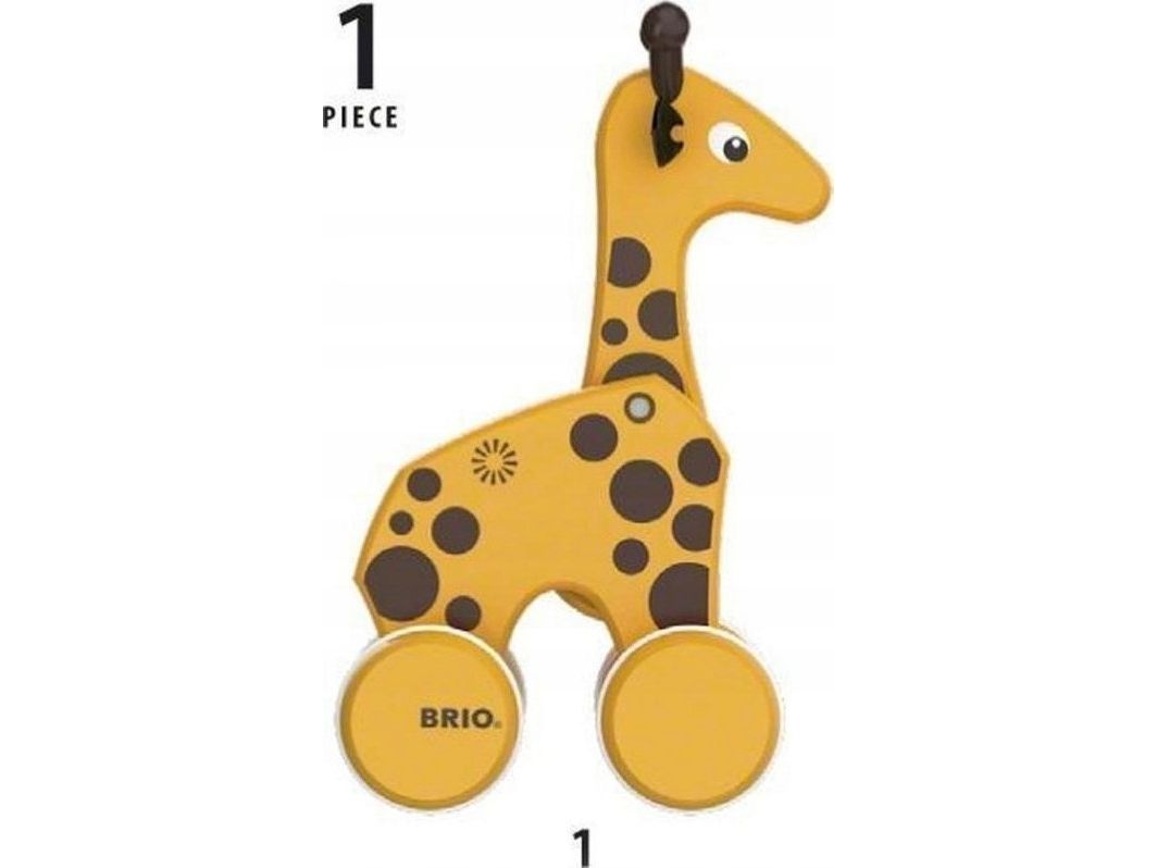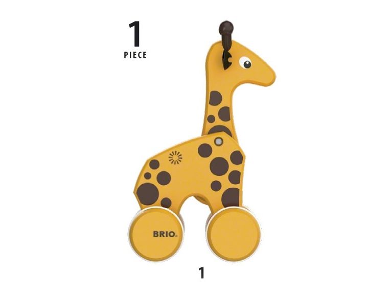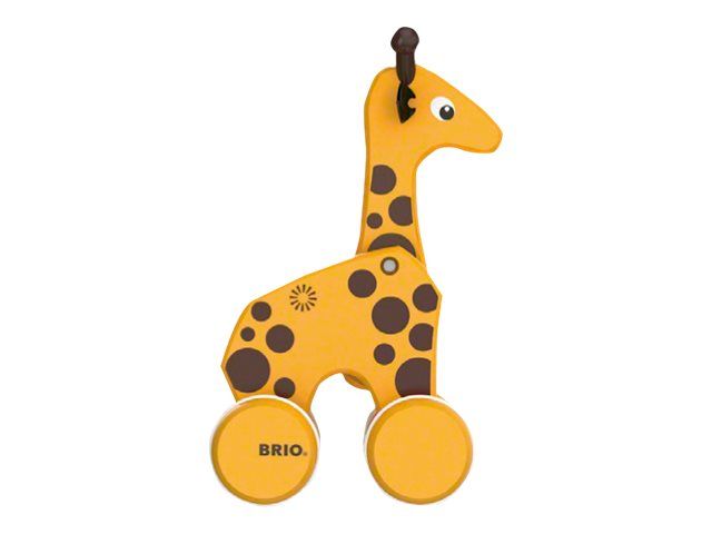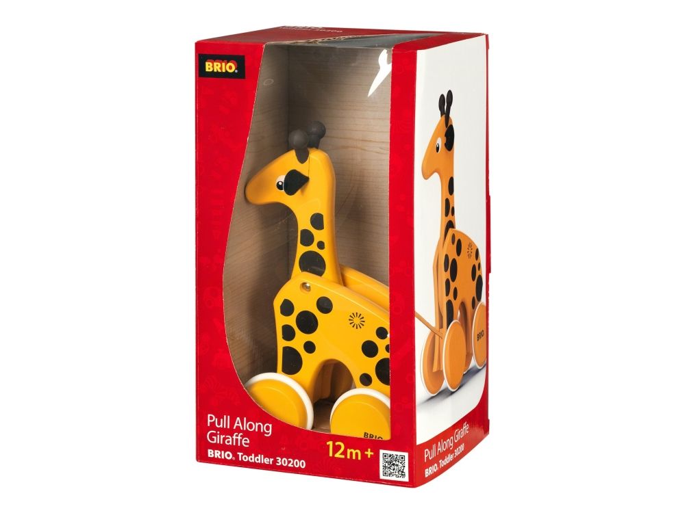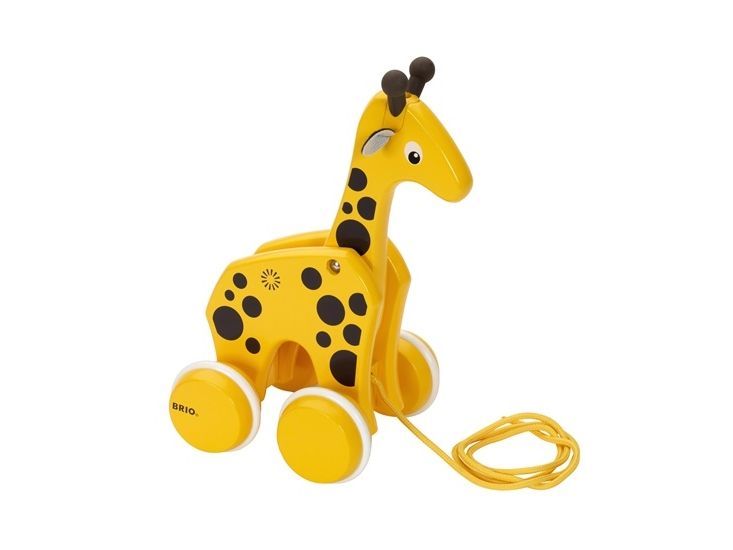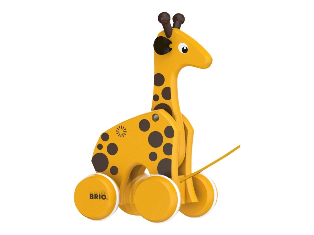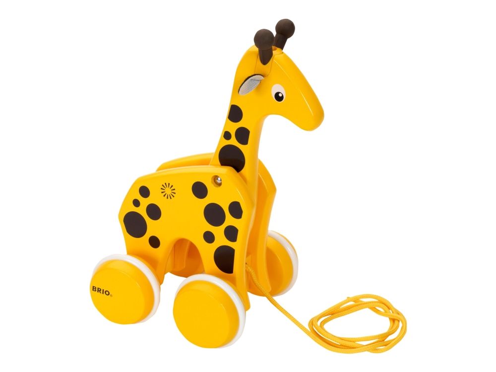 En treleke i klassisk BRIO design. En draleke som oppmuntrer til barnets første skritt. Giraffen følger med og beveger hode når man drar i det gule snøret. Fra 12 måneder.