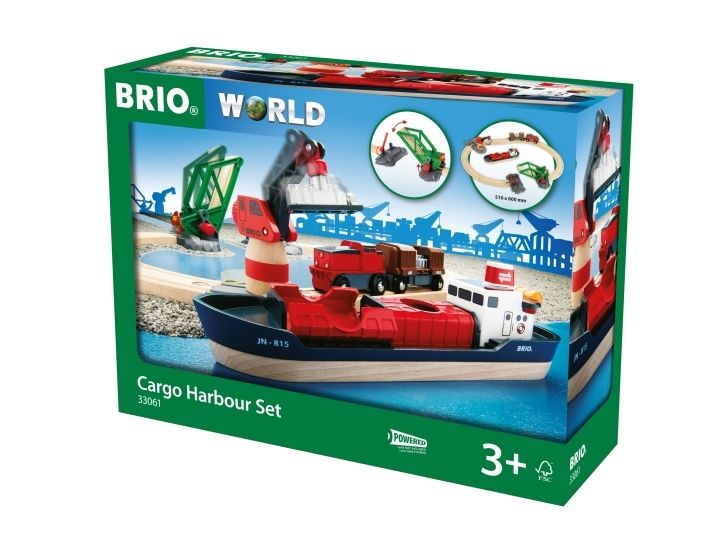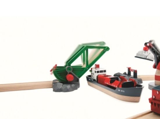 Container skipet seiler over vannet og ankommer havnen med sin last. Det batteri drevne toget venter på å bli lastet ved hjelp av den multi funksjonelle kranen. Skyv opp dørene til godsvognen og putt lasten inni for sikker levering. Når skipet forlater havnen, ikke glem å åpne broen slik at det kan passere på sporene.