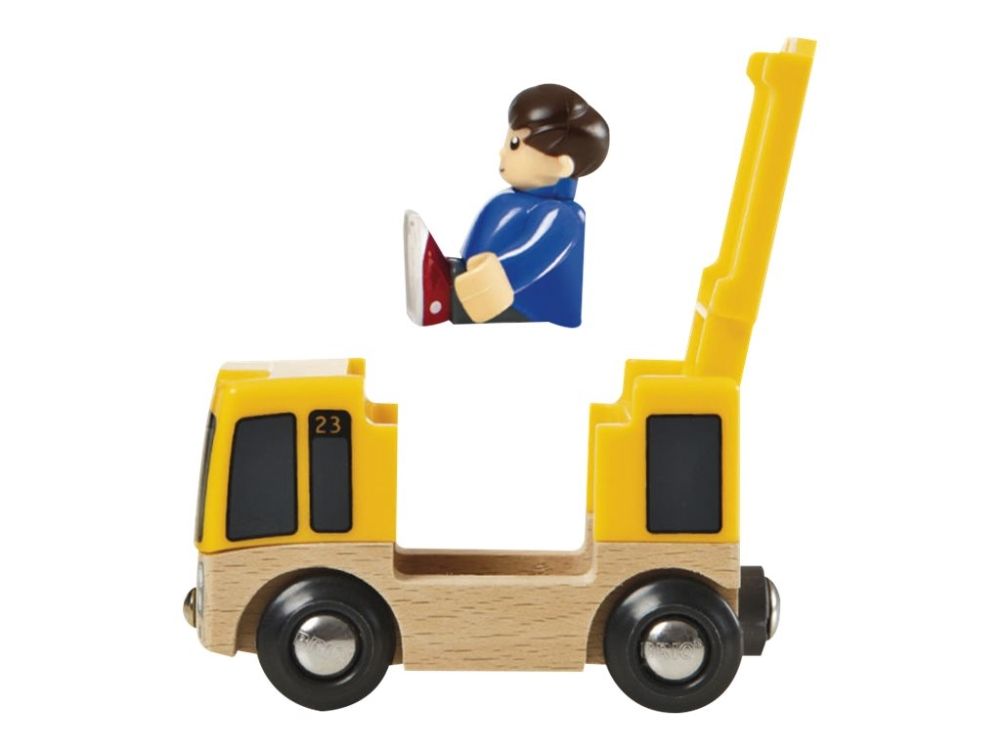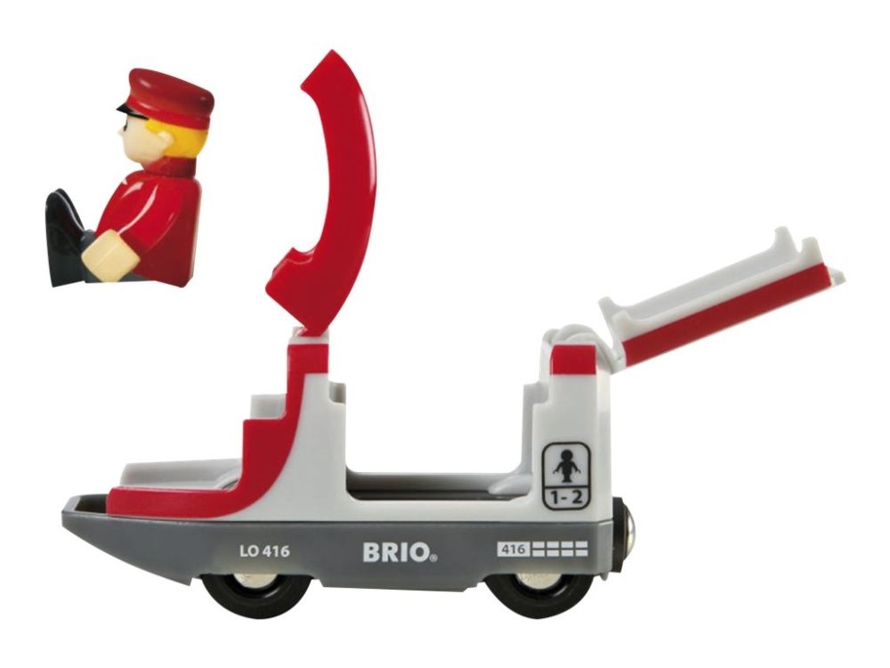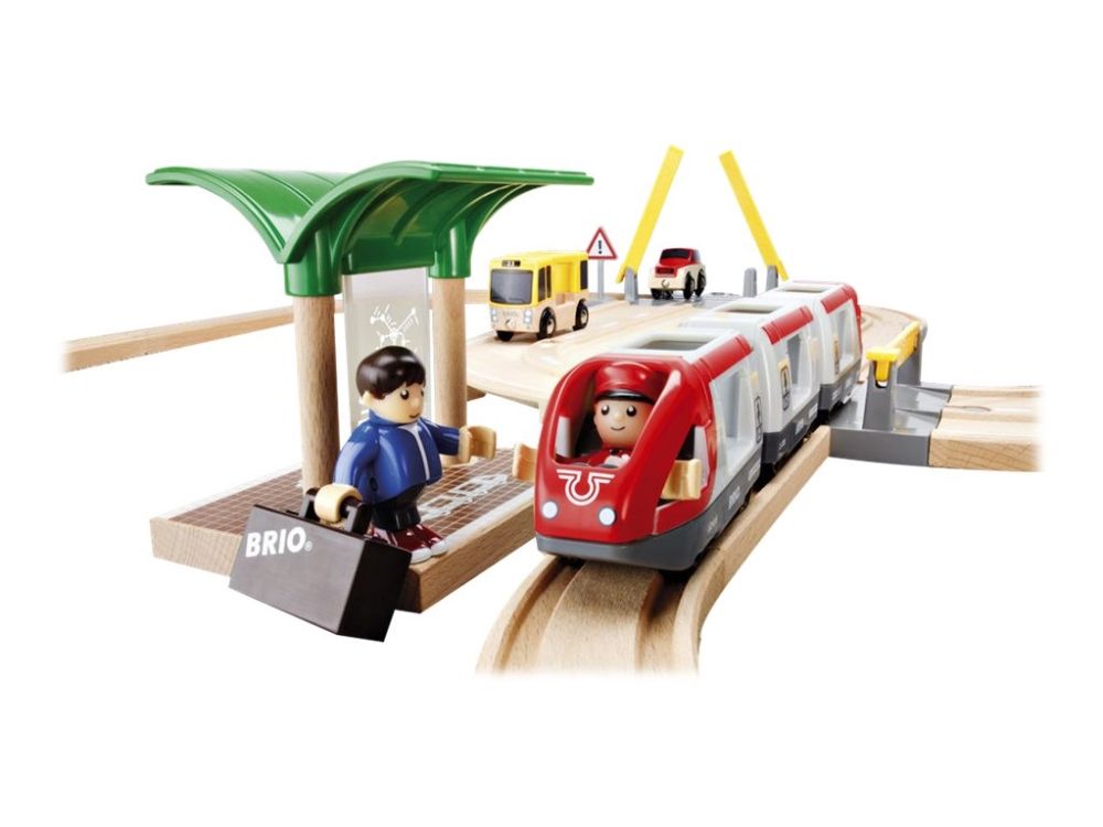 Here comes the passenger train! The two-wagon train is ready to take the passengers around this magnificent BRIO train world. Look out the window and see the cars stopping at the road crossing along the tracks. Lucky that the train arrives on time, some passengers need to switch over and catch the bus!