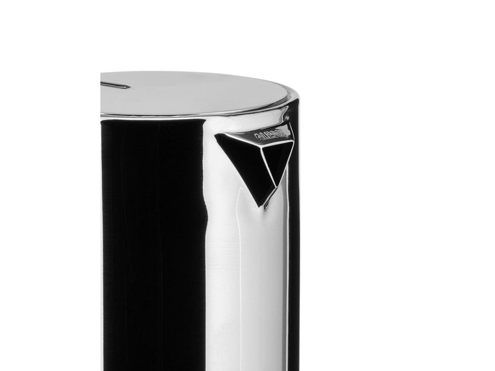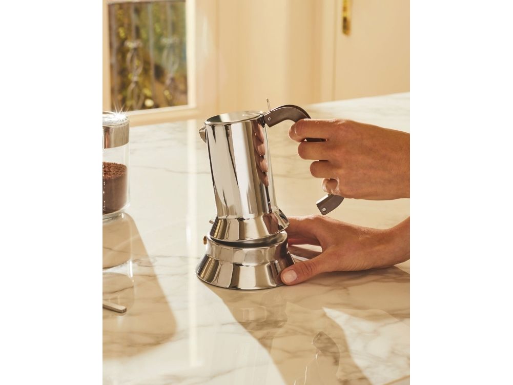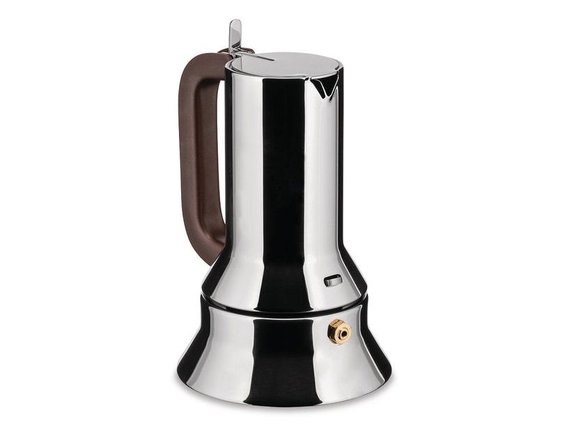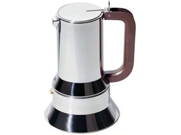 Six-cup espresso coffee maker, in 18/10 stainless steel with cast iron handle. The 9090 isn't just the first espresso coffee maker in Alessi's history: it was also Alessi's first object for the kitchen after the 1930s, the first of Alessi's many Compasso d'Oro awards (1979), Alessi's first object to be inducted into the Permanent Design Collection at the New York MOMA, and of course it's the best-loved Alessi coffee maker bar none, as well as Alessi's first "amphibious object", i.e. it is for kitchen use, but with its high design quality it can also be brought directly to the table.