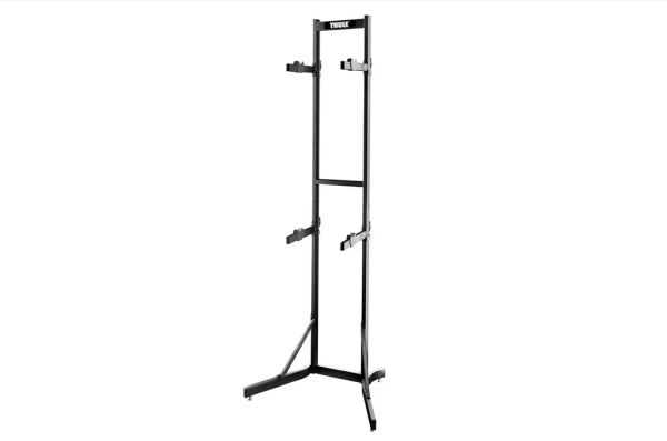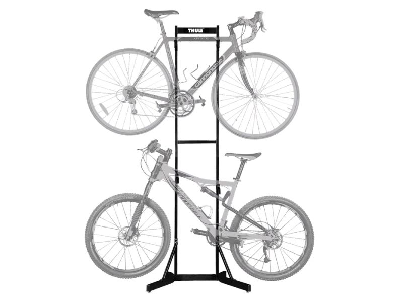 Thule Bike Stacker - Stål stativ til montering af 2 cykler Praktisk fritstående cykelstativ til ophængning af to cykler. Den stærke stålkonstruktion kan bære en samlet cykelvægt på op til 32 kg, og cykelholderens arme kan justeres op og ned uafhængigt af hinanden. Cyklen beskyttes med de V-formede cykelholdere, som fuldt ud beskytter den enkelte cykel. Praktisk stativ til opbevaring, udstilling eller reperation af cykler. Dimensioner: 214 x 79 x 53 cm