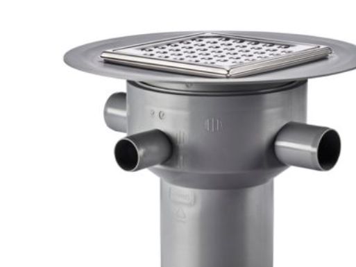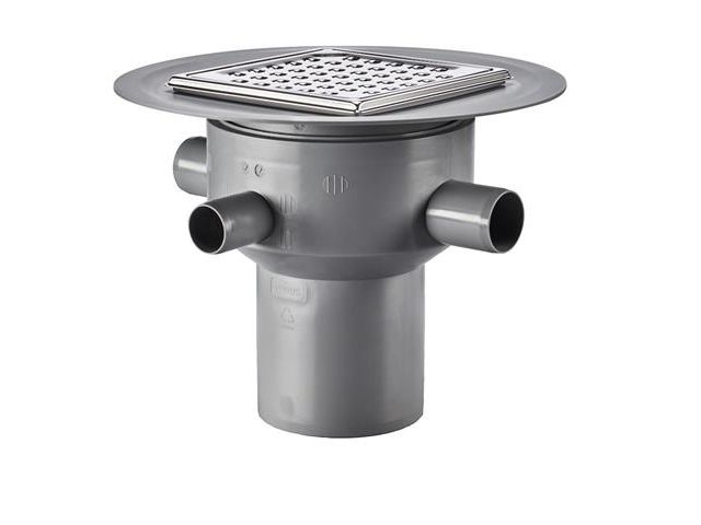 Purus Multiflex Ø110 mm lodret udløb m/flange til smørremembran, 3 sideindløb 1XØ32 mm 2XØ40 mm, Rist/ramme til klinkegulv u/vandlås MaxiOne, VA-Godkendt. Til beton/klinkegulv