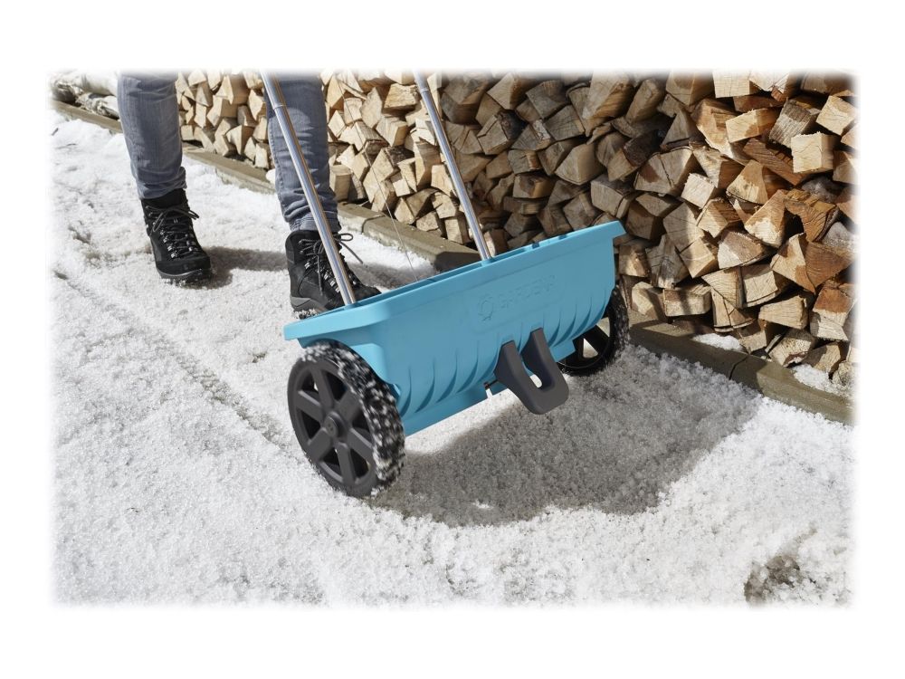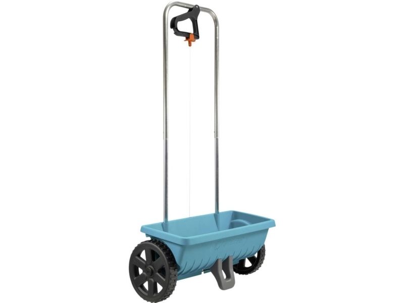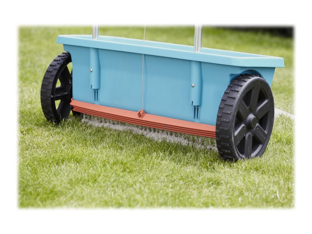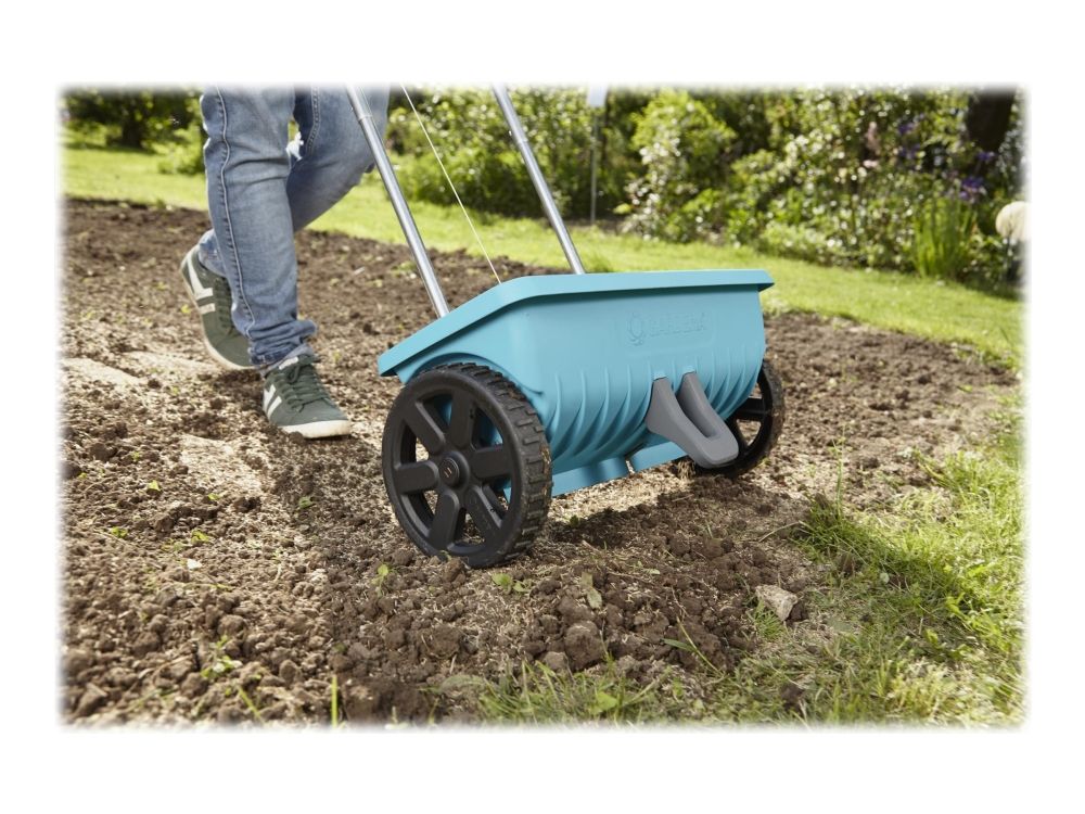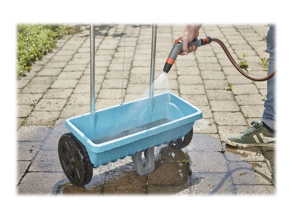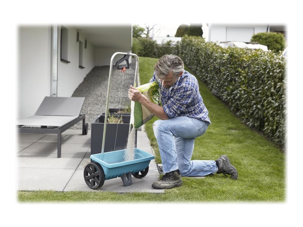 Med Gardena Spreader L kan du oppleve entusiasme i hagen hele året. Bruk den for eksempel til å gjødsle plener på opptil 400 m² i vekstfasen eller til å spre salt i frost og snø. Du kan regulere mengden med det ergonomiske håndtaket, og den praktiske åpne/lukke-funksjonen gjør det mulig å dosere spredemiddelet nøyaktig - i oppreist stilling uten å bøye deg ned. Den spesielle spredervalsen hjelper deg med å fordele materialet jevnt, slik at det alltid kommer dit det skal. Den patenterte låseskiven med myk plastleppe sikrer at det ikke oppstår utilsiktet lekkasje av spredemiddel under og etter bruk. Når du styrer sprederen, får du god støtte på alle underlag takket være de store, kulelagrede hjulene som gir godt grep og best mulig veigrep. I tillegg er vognen laget av materialer som høykvalitetsplast, et robust aluminiumsfeste og et ståltau i rustfritt stål som gjør den motstandsdyktig mot korrosjon og brudd. Du trenger bare vann til rengjøring, det er bare å spraye den med vannslangen. Den høye produktkvaliteten til Spreader L gjenspeiles også i GARDENAs 25 års garanti.