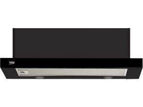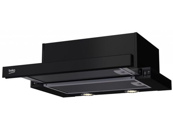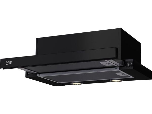 Beko HNT 62210 B. Maximum extraction power: 224 m³/h, Type of extraction: Ducted, Fluid dynamic efficiency class: E. Type: Semi built-in (pull out), Product colour: Black, Control type: Buttons. Number of filters: 2 pc(s). Bulb power: 3 W, Number of bulbs: 2 bulb(s), Bulb type: LED. Energy efficiency class: D, Annual energy consumption: 62.4 kWh, Energy efficiency class (old): D