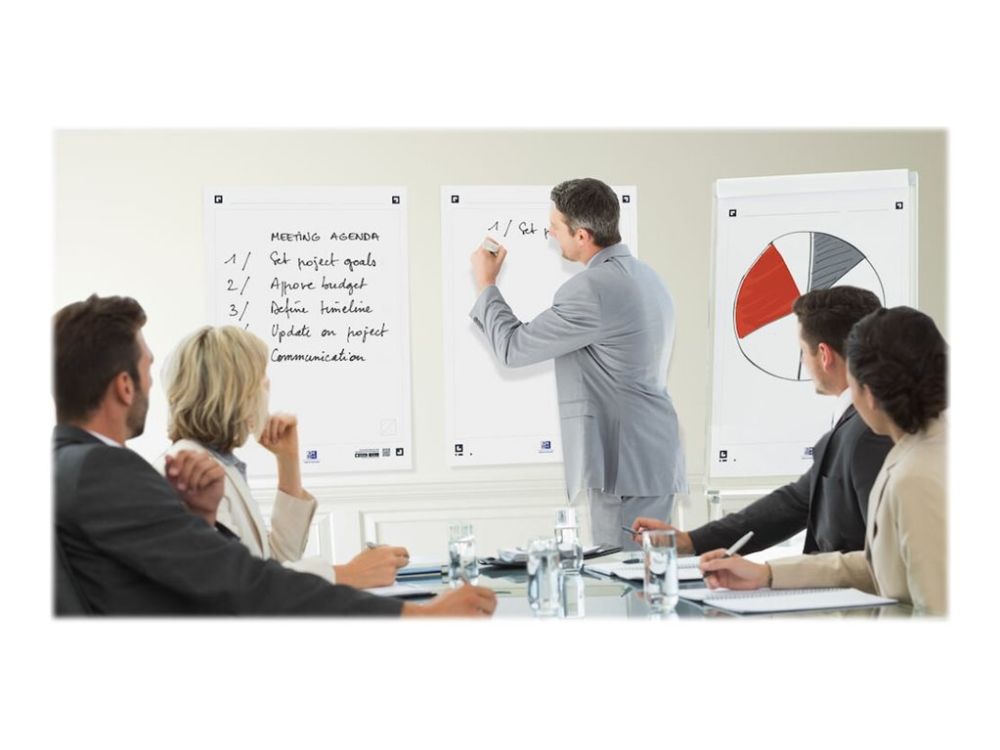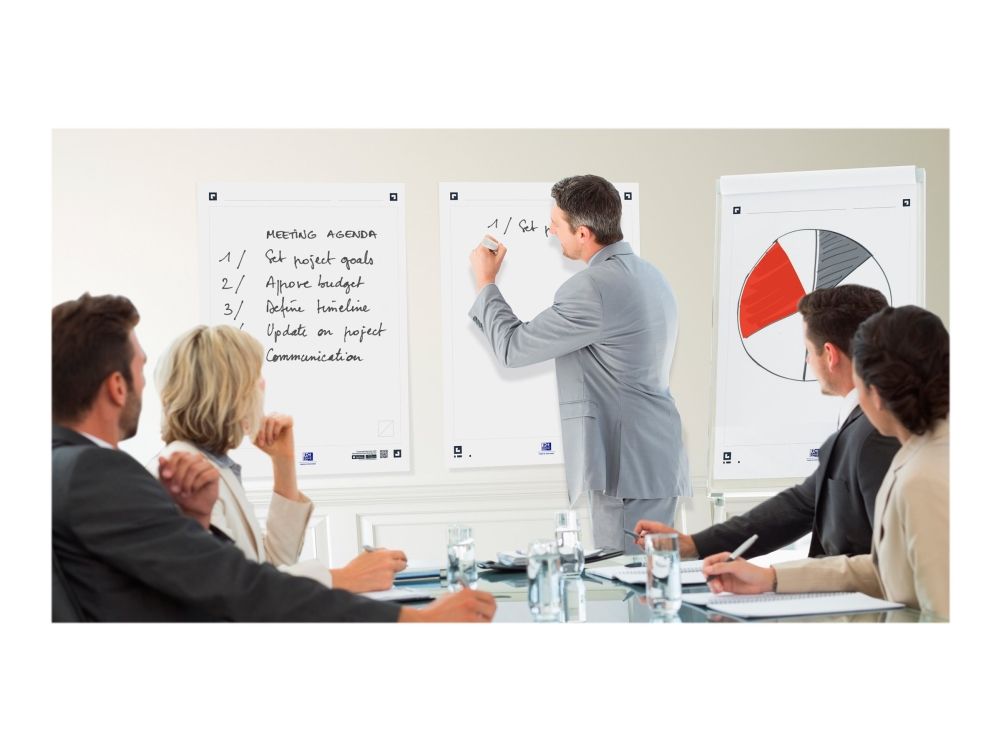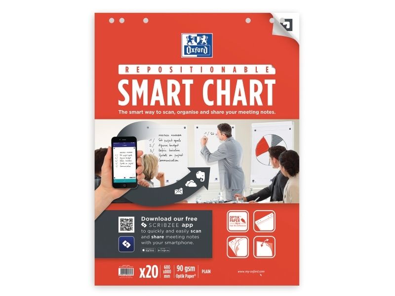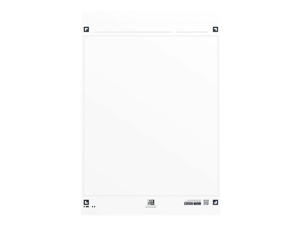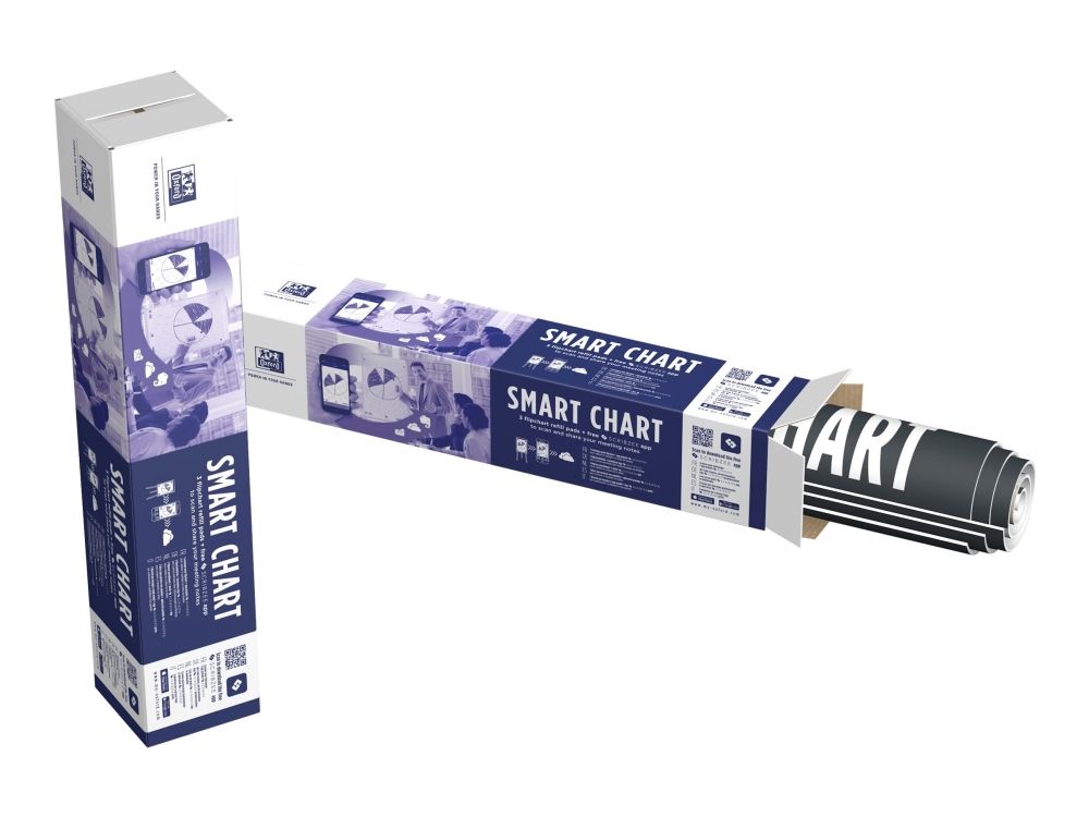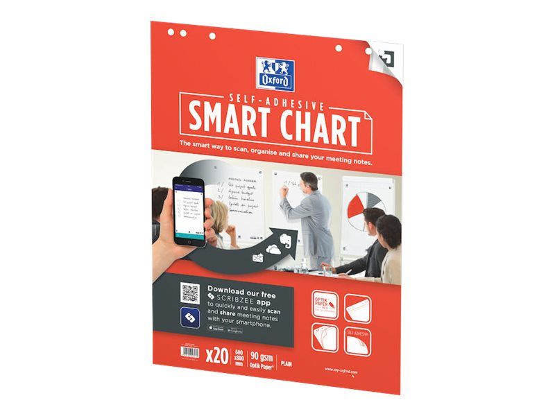 90g optisk papir. Ingen penn som syns gjennom på neste side. Limt på toppen. Universal hulling som passer de fleste flipover stativer på markedet. SmartChart kommer med gratis smarttelefon App. Appen gjør at du enkelt kan lage digitale PDF-filer som kan sendes via e -post og deles via Dropbox eller OneDrive.