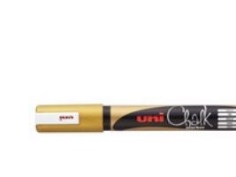 Chalk Marker, Uni-Ball chalkmarker, som skriver i guld. Medium, 1,5-2,5 mm stregbredde. Med den mejselformede spids kan du skifte mellem tykkere og smallere streger ved at dreje pennen. chalkmarkeren er velegnet til overflader som tavle, glas, metal og plast. Best.enhed: stk.