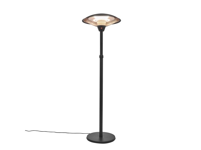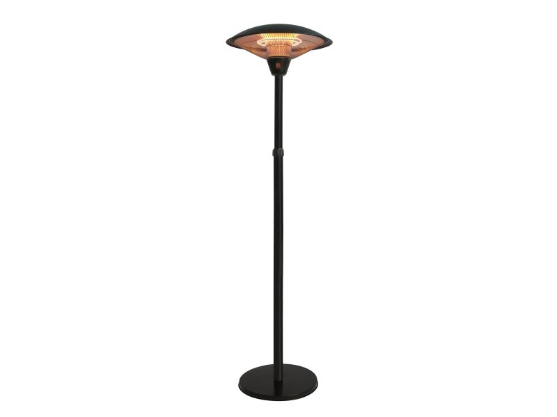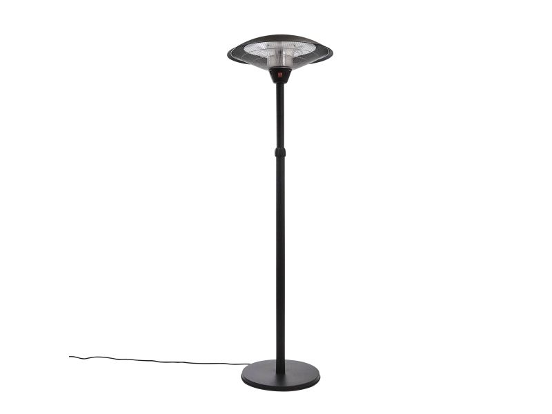 Terrassevarmerens specifikationer Model: 211-371 Type: Gulvmodel Dimensioner: H: 160 - 205 cm - Ø: 59 cm Materiale: Sortlakeret aluminium Rørtype: Halogen clear clare Effekttrin: 900/1200/2100W Strømkilde: 230V - 50Hz - inkl. 180 cm ledning Kapslingsklasse: IP44 Dækningsområde: 6-8 m2 Opstartstid: 2 sek. Energiudnyttelse: ca. 80% Lysreduktion: 80% Driftsomkostning/time: ca. 1,76 - 4,40 kr. CO2 udledning/time: ca. 1 kg Funktionstid ca. 5000 timer Anvendelse: Indendørs og udendørs