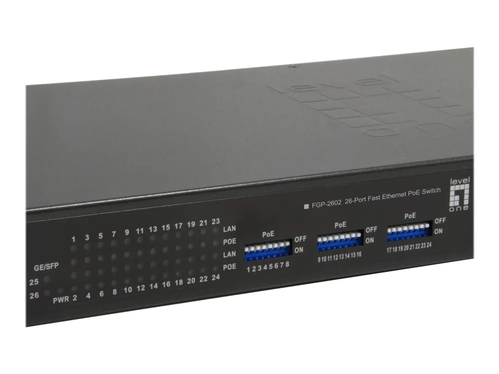 The LevelOne FGP-2602 series are unmanaged PoE switches with 24 RJ45 PoE ports. The switches are IEEE 802.3af/at compliant, providing power and data over a single Ethernet cable to any PoE device, with a total power budget of 150/250/380/500/630W, or up to 30W per port. Ideal for desktops, they are also 19-inch rack-mountable, which provides convenient and flexible installation. The FGP-2602 switches are designed for small-to-medium businesses that require an affordable solution for deploying PoE infrastructure.