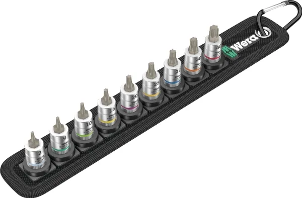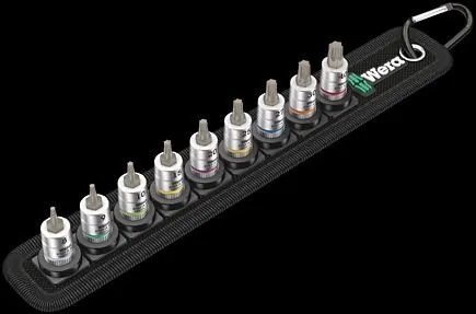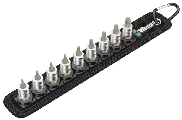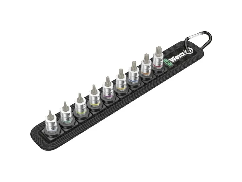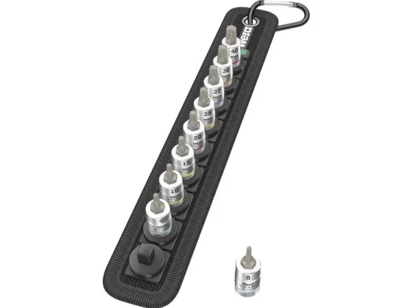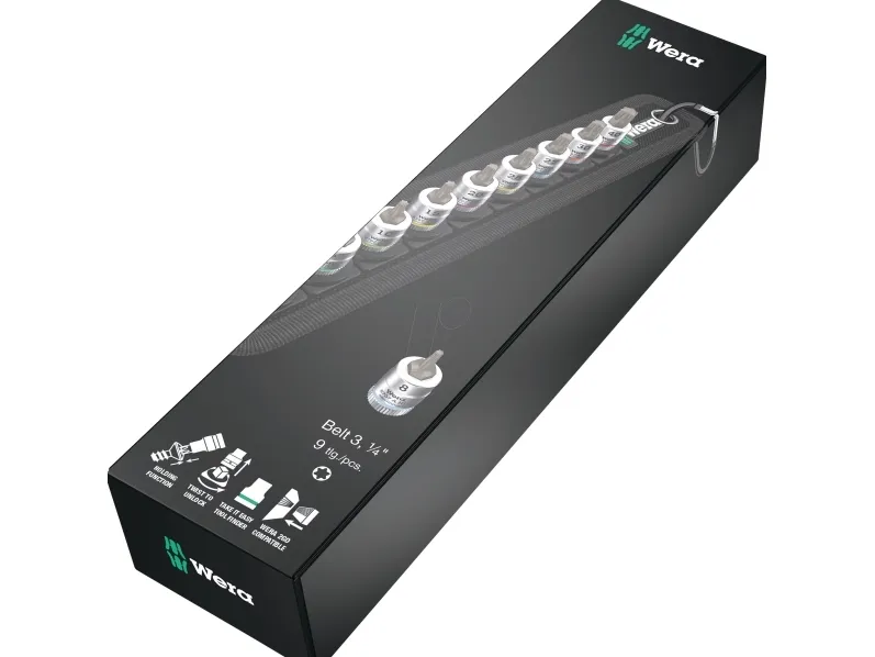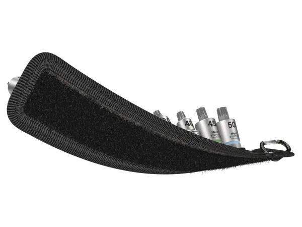 Typically Wera designed robust textile belt with 9 sockets taking up minimal space. A smooth Twist to Unlock mechanism ensures a secure fit and simple removal of the sockets. Comes with „Take it easy“ Tool Finder with colour coding according to size to enable the right tool to be selected easily and quickly. Includes a snap hook for secure fastening to a belt loop or pocket. Especially short, stable bit-sockets with all the advantages of the Wera bit technology. Bit sockets with holding function for particularly convenient screwdriving with reduced risk of losing the screw when approaching the workpiece. Supplied with a nonwoven reverse side and hook and loop strips for simple attachment e.g. to a wall, shelf, tool trolley and to the Wera 2go tool transport system.