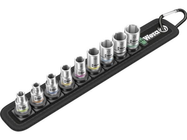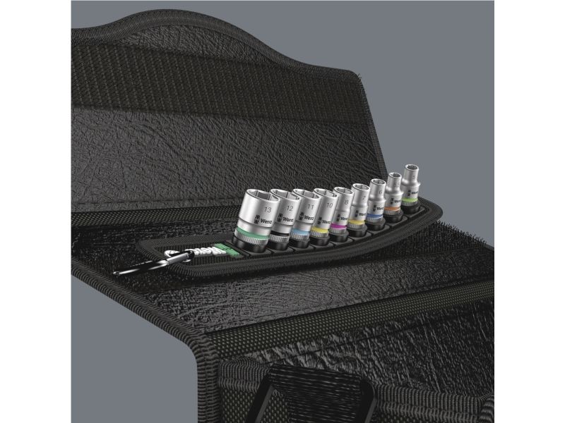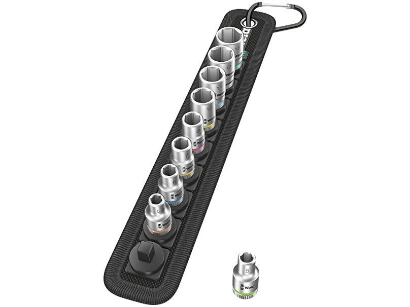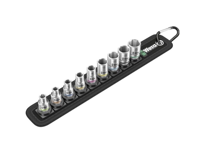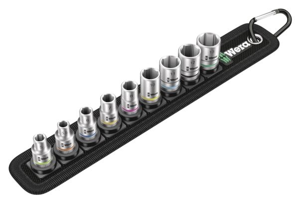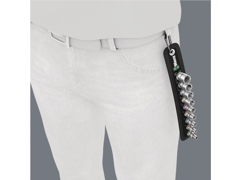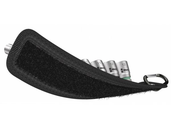 Typically Wera designed robust textile belt with 9 sockets taking up minimal space. A smooth turning Twist to Unlock mechanism ensures a secure fit and simple removal of the sockets. Comes with „Take it easy“ Tool Finder with colour coding according to size to enable the right tool to be selected easily and quickly. Includes a snap hook for secure fastening to a belt loop or pocket. Supplied with a nonwoven reverse side and hook and loop strips for simple attachment e.g. to a wall, shelf, tool trolley and to the Wera 2go tool transport system.