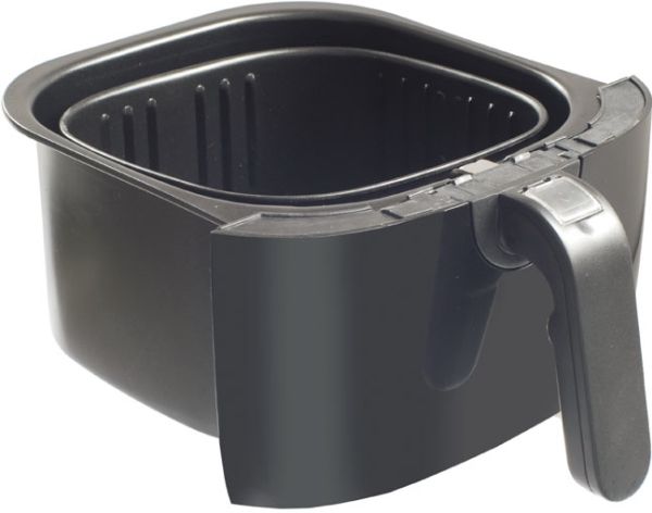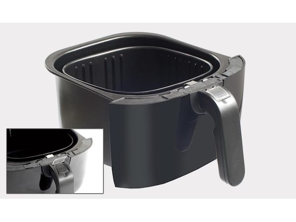 Når maten er ferdig, trekkes kurven ut og med et klikk på håndtaket kan kurven tas av beholderen og du kan enkelt og greit helle den tilberedte maten på f.eks. et serveringsfat og tilbake i beholderen, vil alt overflødig fett bli funnet.