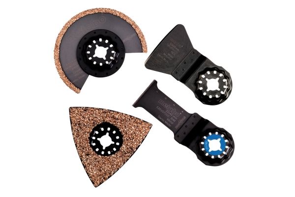 Fliselægnings-sæt til MultiTool, 4-dele. Flise-sæt til alsidige renoverings- og ombygningsarbejder, som fjern mørtel eller fliselim, fræsning af fuger på væg- og gulvfliser, mindre udskæringer i bløde vægfliser. Sæt bestående af: 1 x segmentsavklinge 85 mm HM (fliser), 1 x trekantslibeplade 78 mm HM (fliser), 1 x skraber fast 52 mm HCS, 1 x dyksavklinge 32 mm BIM (metal).