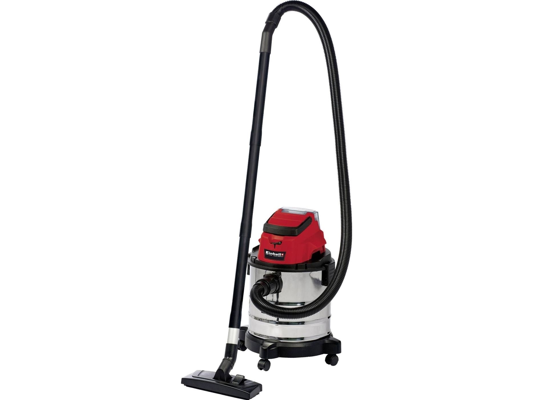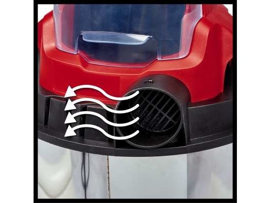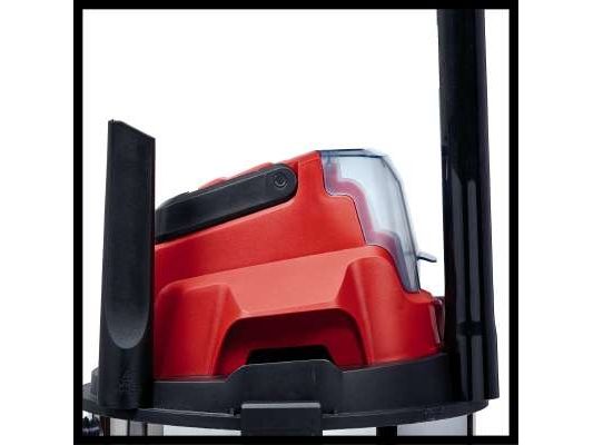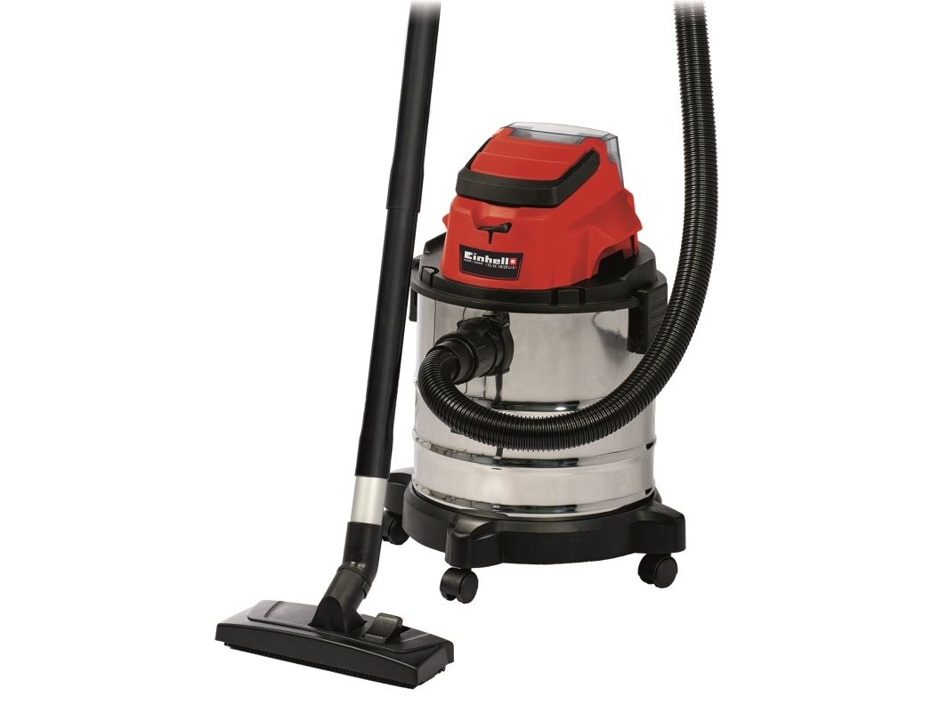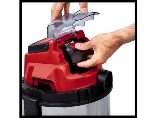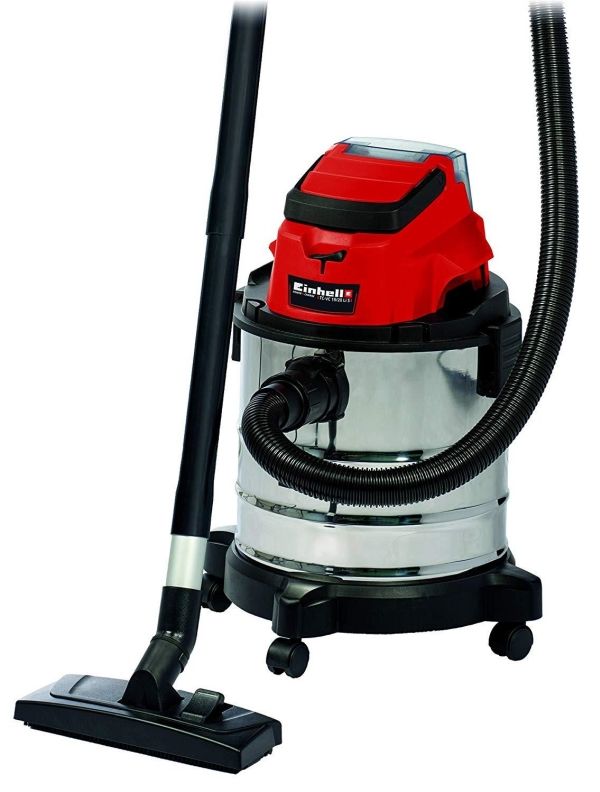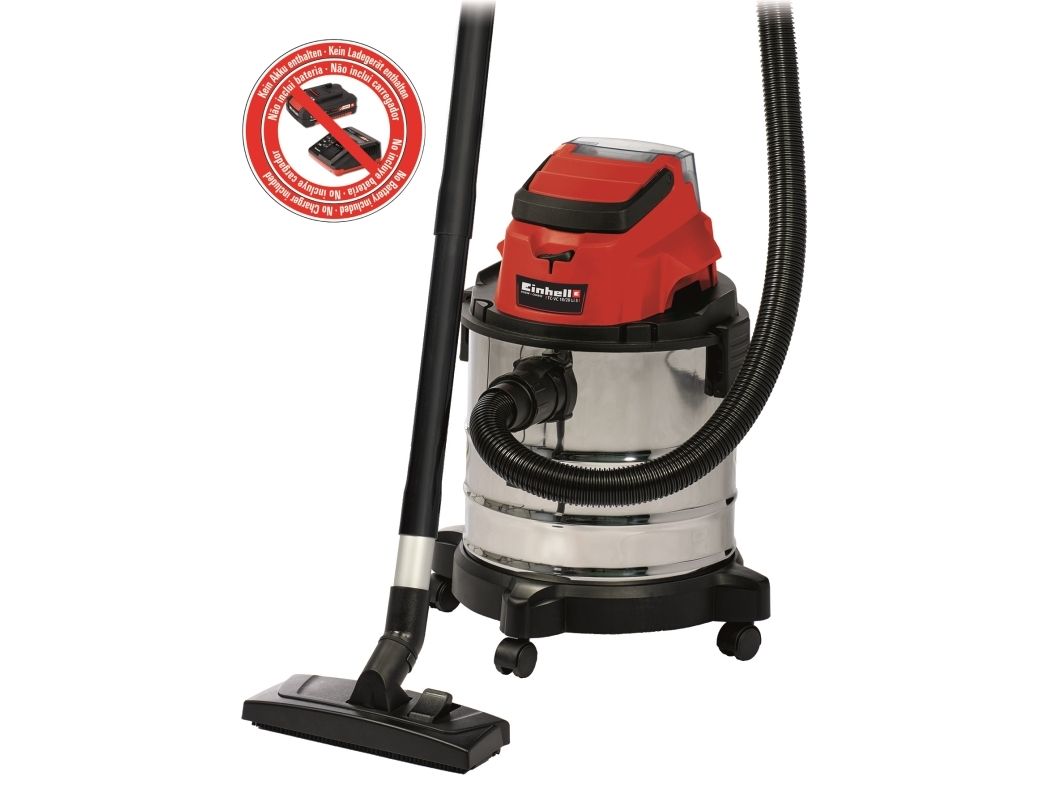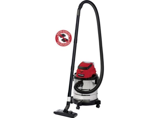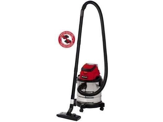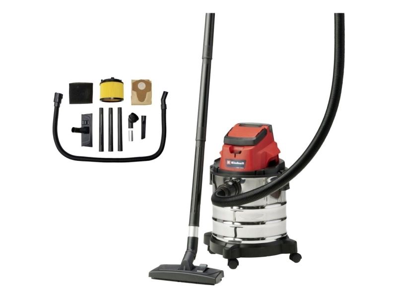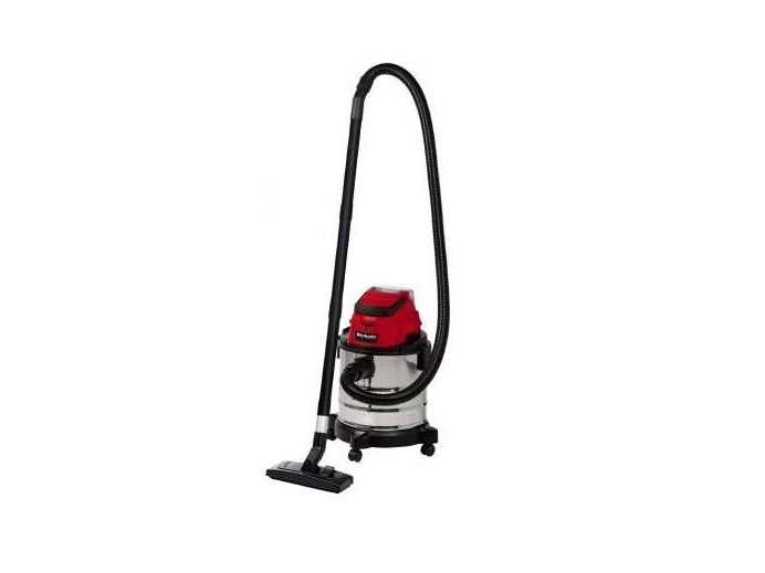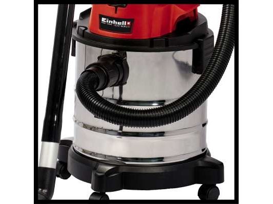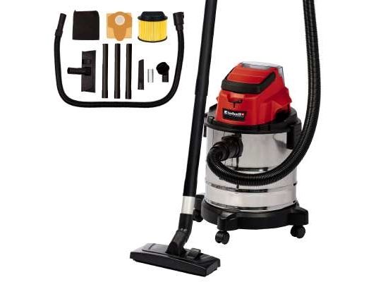 The Einhell TC-VC 18/20 Li S–Solo våd- og tørstøvsuger er en uvurderlig hjælper for den krævende gør-det-selv’er ved rengøring i værkstedet og garagen. Den kan også bruges på terrassen eller altanen, i hjemmet og i bilen. I hjemmet er overfladerengøring af tæpper, glaserede klinker eller klinker med åbne porer ofte ikke nok. Våd- og tørstøvsugeren giver grundig rengøring og er et ideelt supplement til almindelige rengøringsapparater til hjemmet, når det gælder genstridigt snavs, som er trængt ind i fladerne. Våd- og tørstøvsugeren er kraftfuld og indgår i Power X-Change-familien. Alle Li-ion-batterier og opladere i den højtydende Power X-Change-familie kan bruges sammen med alle værktøjer med Power X-Change-teknologien. Dette produkt leveres uden batteri og lader. Disse kan købes separat. Våd- og tørstøvsugerens beholder i rustfrit stål har en kapacitet på 20 liter til både snavs og væsker. Den er rustfri, robust og bygget til at holde. Våd- og tørstøvsugeren har en indbygget blæsestuds, så du kan rengøre svært tilgængelige steder som f.eks. hjørner og fordybninger i køkkener og badeværelser med luft. Det kræver særligt udstyr at støvsuge tæpper og faste gulve effektivt. Der medfølger derfor et kombinationsmundstykke specielt designet til tæpper og faste gulve. Der medfølger også et sprækkemundstykke, som er effektivt i hjørner og fordybninger i badeværelset, køkkenet, stuen, kælderen, på altanen og på udsatte steder som f.eks. entreen. Der medfølger også et møbelmundstykke, som er særligt velegnet til polstrede møbler og bilsæder. Slangesystemet med en diameter på 36 mm sikrer en høj luftstrøm, så snavset opsuges uhindret. Der medfølger en plastslange og et 3-delt rør. Våd- og tørstøvsugeren leveres komplet med en støvsugerpose af papir, et vævet filter og et skumfilter. Den er forsynet med en praktisk tilbehørsholder, så tilbehør og adaptere kan opbevares overskueligt og let tilgængeligt. Våd- og tørstøvsugeren kan let flyttes, da den er forsynet med et bærehåndtag og 4 hjul.