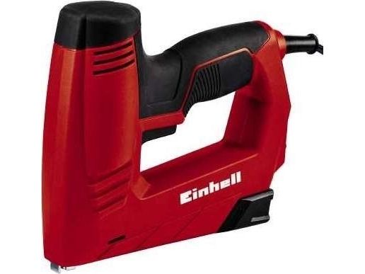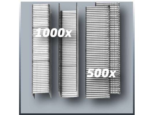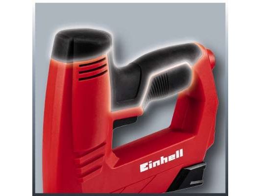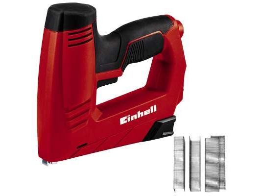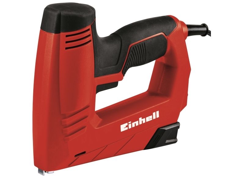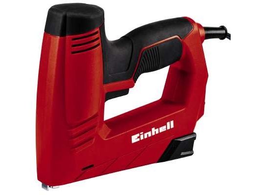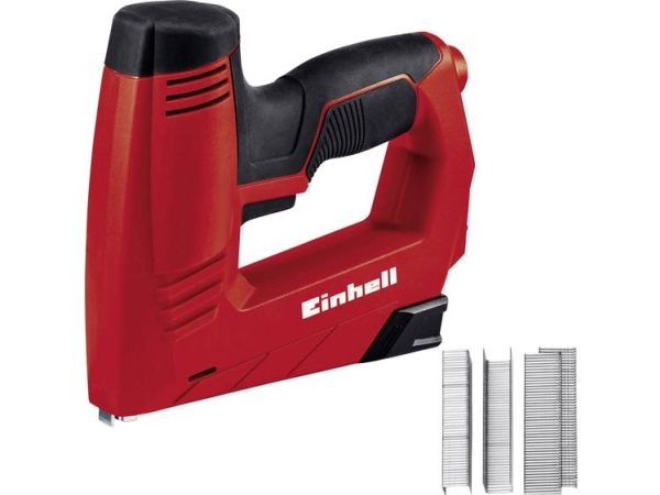 The electric stapler TC-EN 20 E is a functional allrounder for the home, workshop or handycraft room. It has a wide range of uses: In the home the Einhell electric stapler can be used for stapling sheets of paper together, fitting new covers to seats, fastening textiles or doing small repairs. In the hands of the hobby DIY enthusiast the electric stapler is ideal for both small and large projects: Securing grilles on small farm sheds is no problem, and fastening foil and insulation material is also a breeze. For optimum results it has an electronic impact focrce preset. A safety nose provides protection against accidents: The staples and nails are only released when the stapler is in the working position. The magazine level indicator is plainly visible. For prolonged assignments and intensive projects the ergonomic handle prevents fatigue and contributes to user-friendly tireless operation. The soft grip provides the user with a safe and comfortable handling in any position. Complete with 1000 staples and 500 nails.