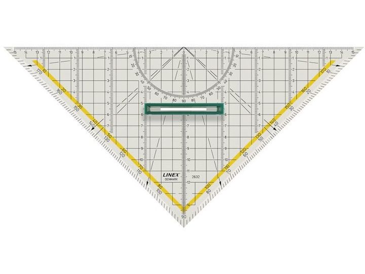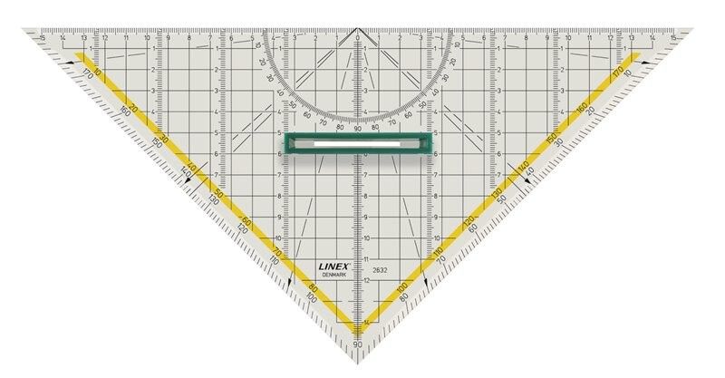 Med målnet og tværmålsinddelinger samt aftageligt håndtag. 0-punkt midt på hypotenusen. Gul stribe fremhæver modgående skala. Kan bruges som lineal, tegnetrekant og vinkelmåler. Med facet og tuschknopper.