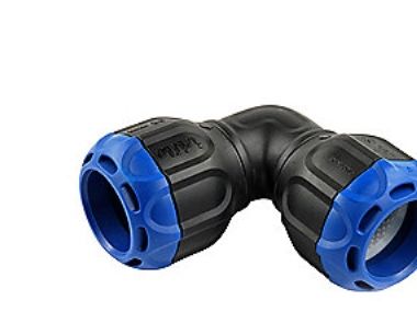 Isiflo Sprint vinkel 90° med 'Push-in' kobling til PE-rør. Fremstillet af korrosionsfrit kompositmateriale. Godkendt til drikkevand. Temperaturområde 0-40°C