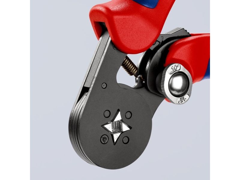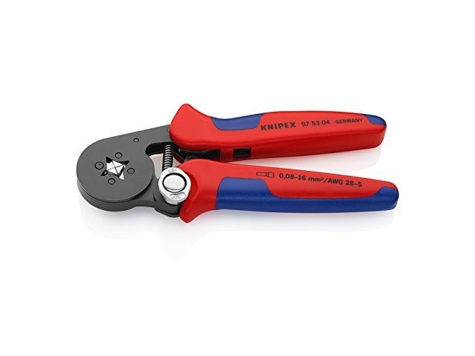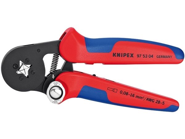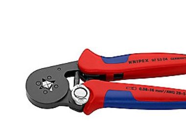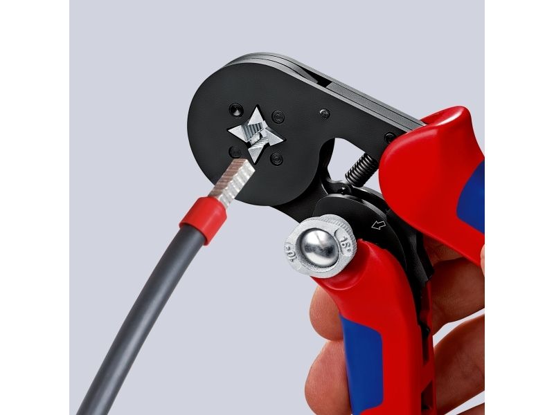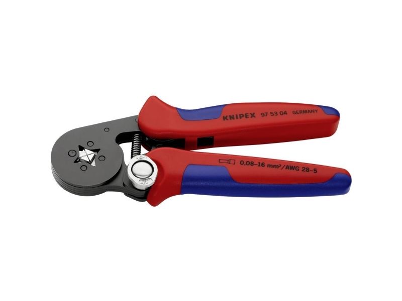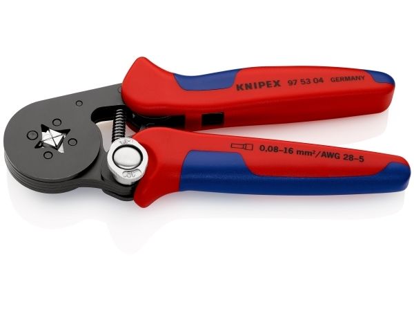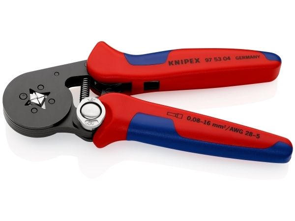 97 53 04 Selvindstillelig crimptang til kabeltyller Standardiseret sammenpresning af kabeltyller iht. DIN 46228 del 1 + 4 Samme høje crimpkvalitet takket være tvangsspærring (med låse). Crimptrykket er præcist indstillet (kalibreret) fra fabrikkens side. Kraftforstærkning pga. knæstang for arbejde uden anstrengelse Ergonomisk og kompakt konstruktion, letgående funktion og lav vægt. Krom-vanadium-elektrostål i specialkvalitet, oliehærdet .