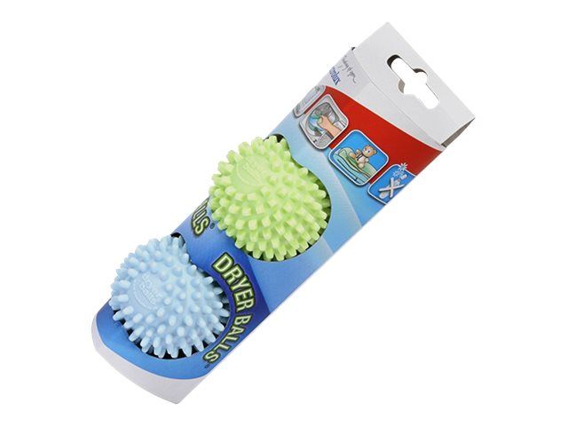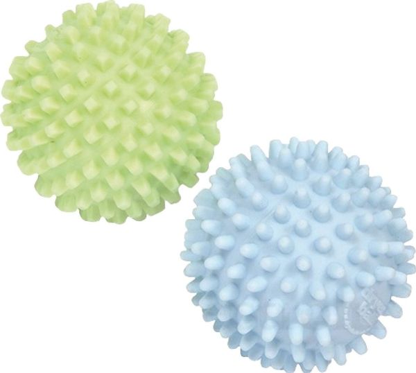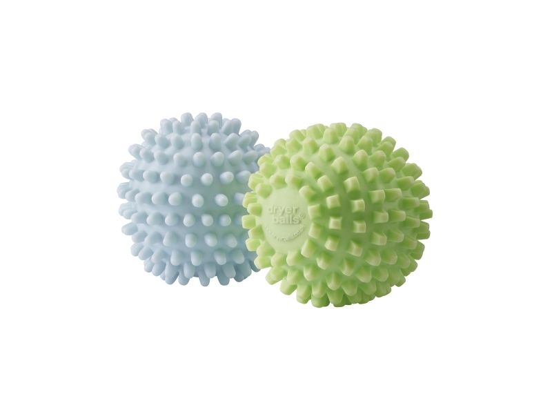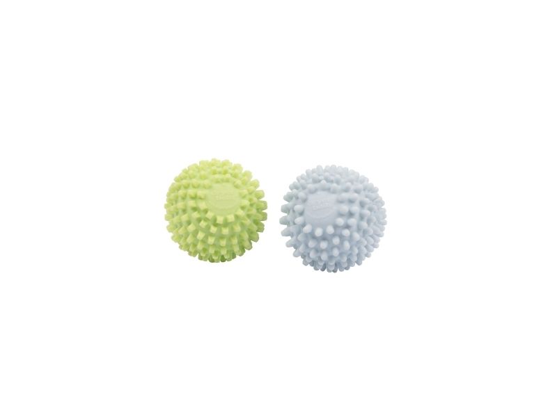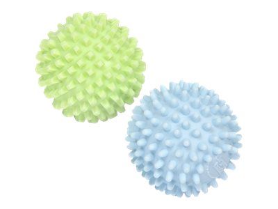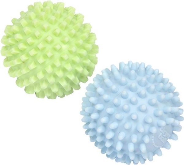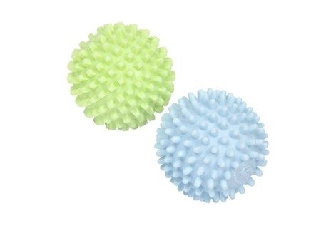 The dryer balls use specially designed nodes to physically break down the stiffness, created by water drying in fabric, thus softening laundry without the introduction of toxic chemicals. The two balls have different tensile strengths (one is harder than the other) with different shaped softening nodes. Square nodes compress and soften fabric; round nodes relax fibers to reduce hardness. They work in combination to lift and separate the laundry whilst tumble drying. They also retain the heat and transfer it to the clothes as they tumble, aiding the drying process.