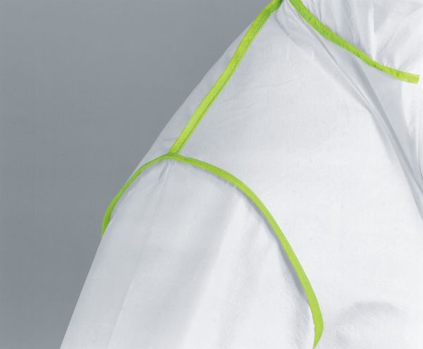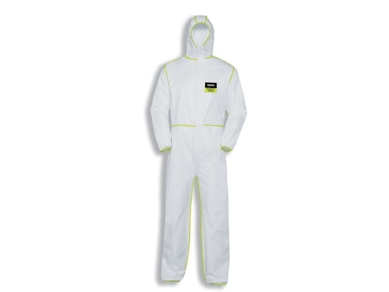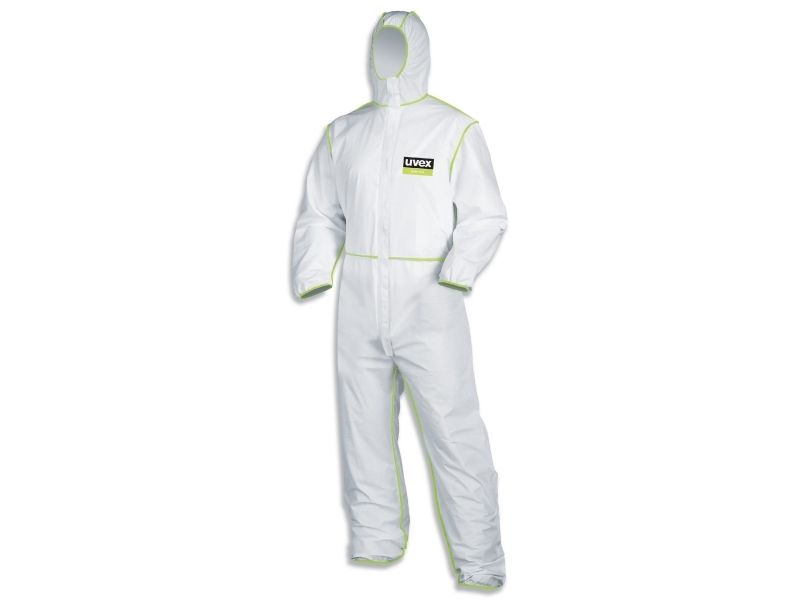Coverall uvex 5/6 comfort Disposable chemical protection Type 5/6 Model-no.: 9877, Art.-no.: 98710 Colour: white/lime Material: PP spunbond laminated with PE film, SMS back section