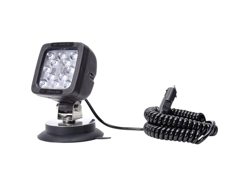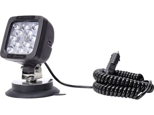 Led-arbejdsprojektør 12-24volt med magnetfod 12 LED · 2400 lumen · E-godkendelse / ECE · Tænd/sluk-kontakt på forlygtens bagside · IP 66/68 · 7 m spiralkabel med cigarettænderstik · Magnetfastgørelse 2400 lumen Spiralkabler Kontakt på bagsiden Magnetfastgørelse