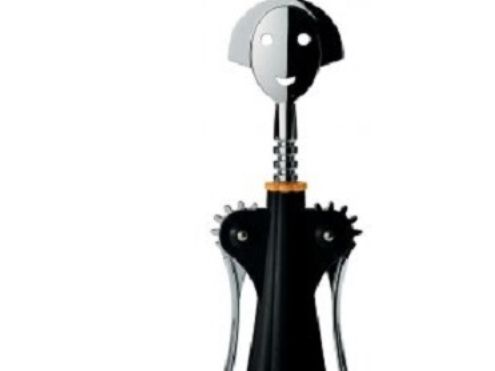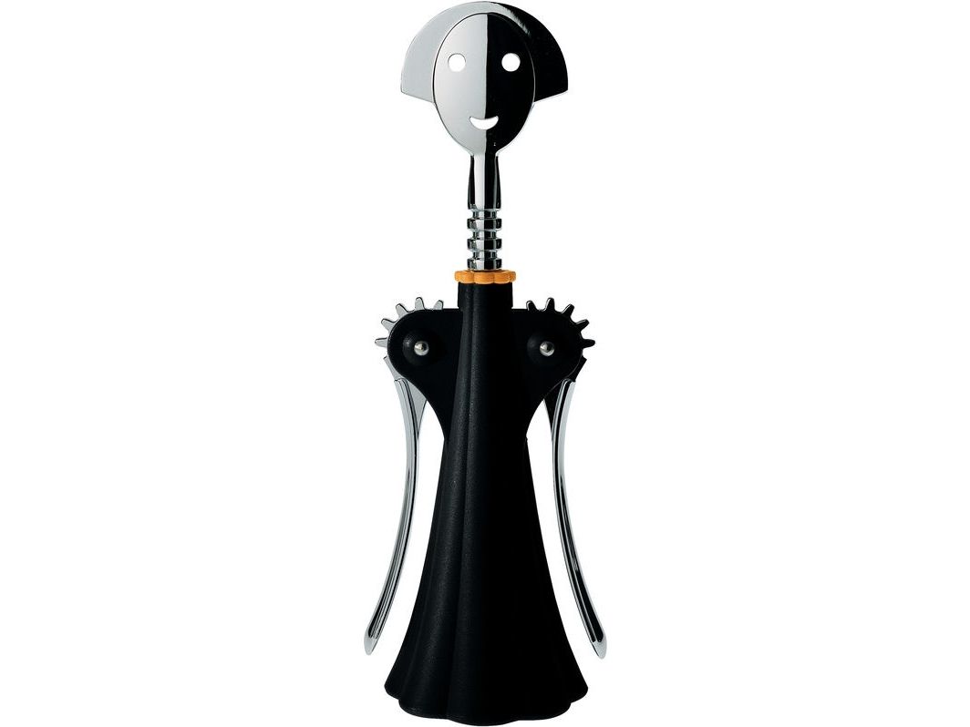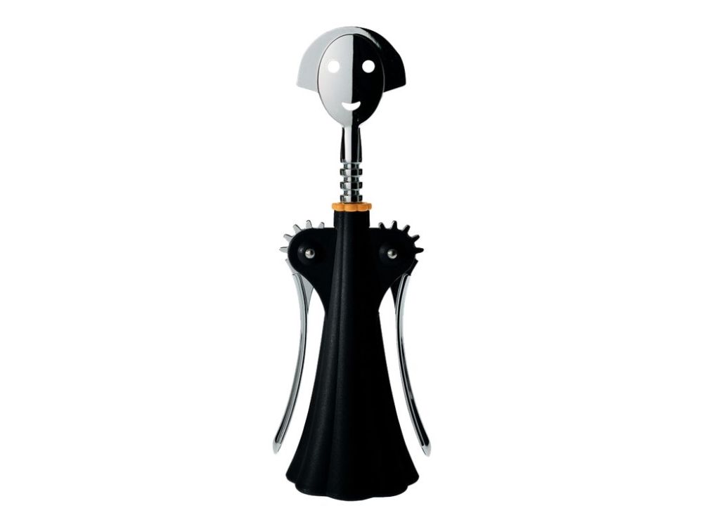Corkscrew in PA, black and chrome-plated zamak. A best seller since it was first produced in 1994, the Anna G. corkscrew is a tongue-in-cheek homage to a real woman. Her smiling face has become something of a cult figure over the years, giving birth (so to speak) to a rich family of objects for the table and kitchen in a wide range of materials.