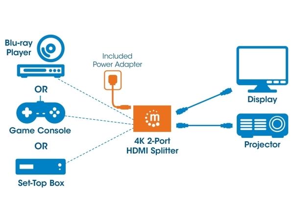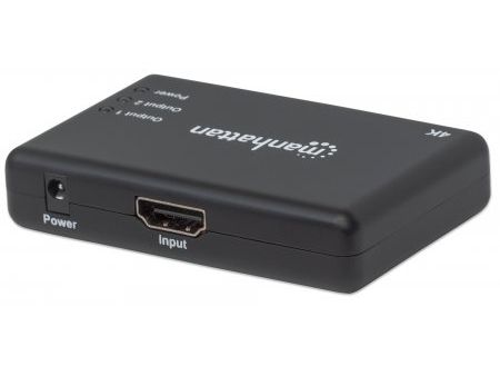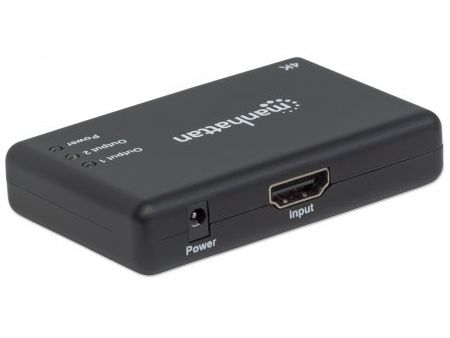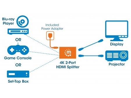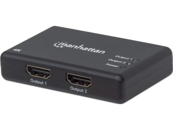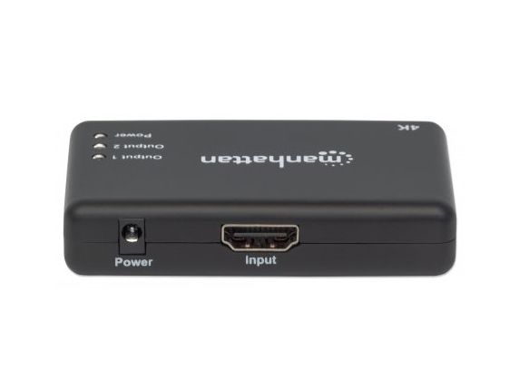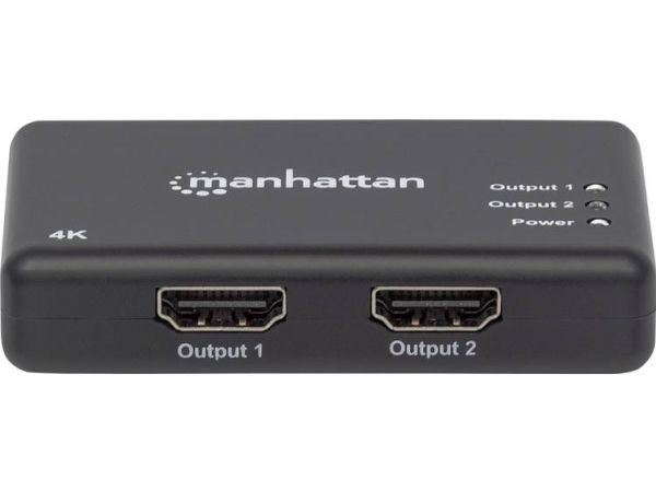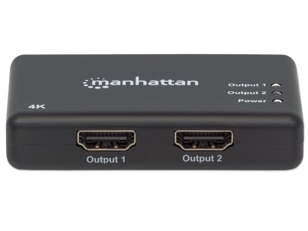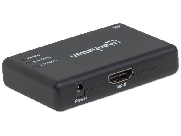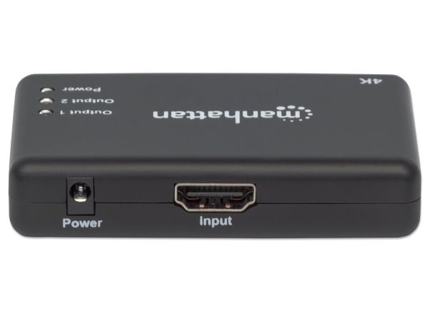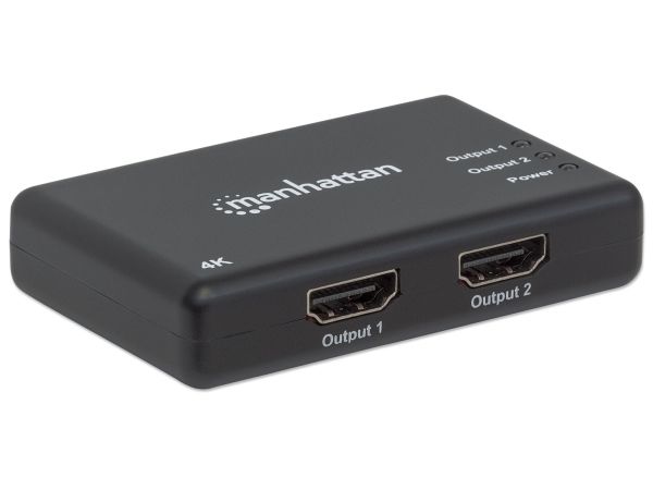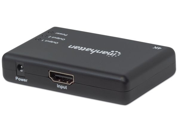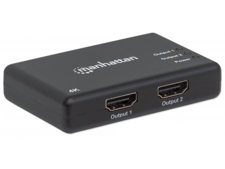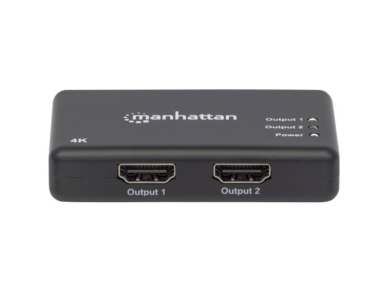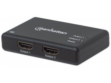 The Manhattan 4K 2-Port HDMI Splitter with built-in booster streams a 4K HDMI signal from a single UHD source to up to two UHD displays.