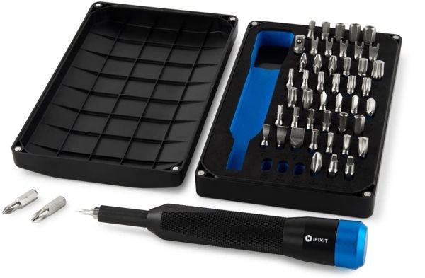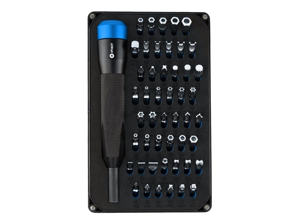 The Mahi Driver Kit includes iFixit’s 1/4" aluminum screwdriver handle with magnetic bit socket, knurled grip, and swivel top—plus 48 driver bits.