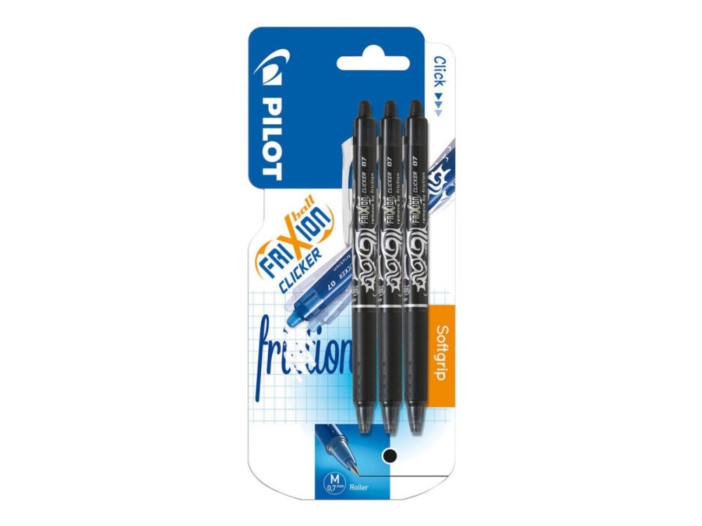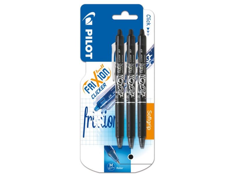 Pilot FriXion pennen er med en helt ny revolutionerende blæk, hvor det skrevne let kan viskes ud igen. Blækket er varmefølsomt, og forsvinder ved den friktion der opstår, når der gnides på det skrevne. Der kan skrives, slettes og rettes i det uendelige uden at papiret ødelægges. Pennen glider let hen over papiret med en klar og tydelig streg. FriXion Clicker er med klikmekanisme og konisk spids.