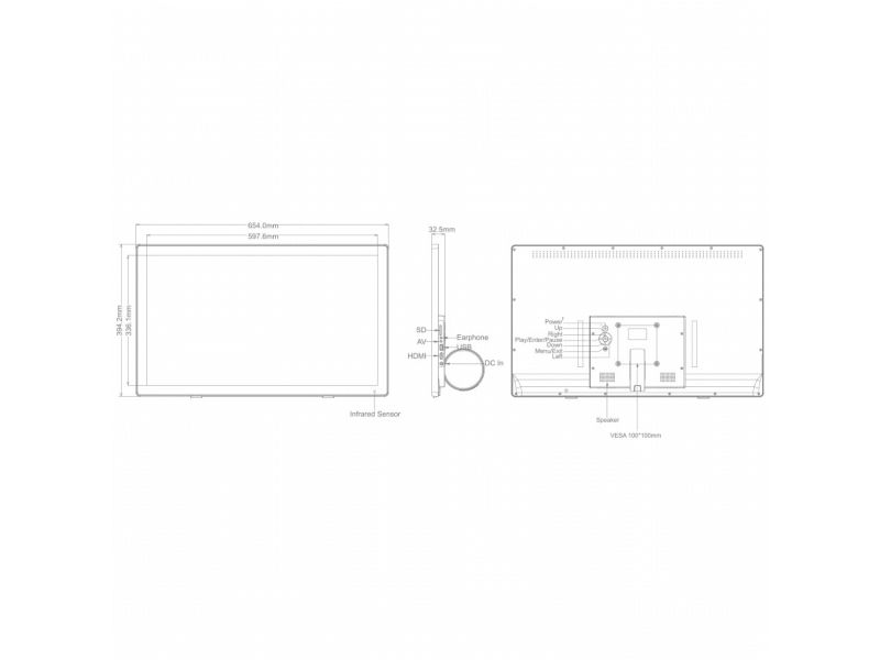 Display Size 68.58 cm (27"), photos and videos in full HD quality, 16:9 Optics, stereo speakers (2x 3W), stereo audio/headphone output, SD Card slot, USB 3.0, HDMI-in and AV-input, auto-start, Auto-play and auto-repeat function, remote control.Braun Photo Technik 21417. Display diagonal: 68.6 cm (27"), Display resolution: 1920 x 1080 pixels, Display: IPS. Compatible memory cards: SD. Interface: USB 2.0, Headphone connectivity: 3.5 mm. Speaker power: 6 W. Product colour: Black