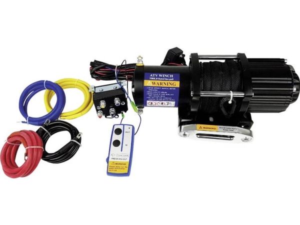 Tovspil 12 V 3150 kg syntetisk wire 15 m syntetisk reb, 12 V motor tovspil med syntetisk reb, trækkraft op til 3150 kg. Til biler eller særligt egnet til montering på quads, ATV (4x4) og erhvervskøretøjer. Elektronisk frem- og tilbagespoling via kabelfjernbetjening eller trådløs fjernbetjening. Manuelt friløb og automatisk bremse ved strømsvigt. Vigtigt: Rul aldrig kablet helt af, kun til den røde markering på rebet! 3-trins planetgear og alu-wievindue. Togets hastighed 680 kg - 2,4 m/min. Med udførlig monteringsvejledning. Specifikationer: Trækkraft 3150 kg ved brug af en styrerulle (medfølger ikke) Belastningsoptagelse ca. 11 A ved start op til 100 A ved fuld belastning Drevreduktion 153:1 Motor 12 V jævnstrøm 1,2 kW Mål 335 x 114 x 120 mm Tromlemål 38 mm diameter - bredde 73 mm Syntetisk reb, 15 m længde, 5,5 mm diameter. Monteringsplade 124 x 76 mm. Vægt: 11 kg